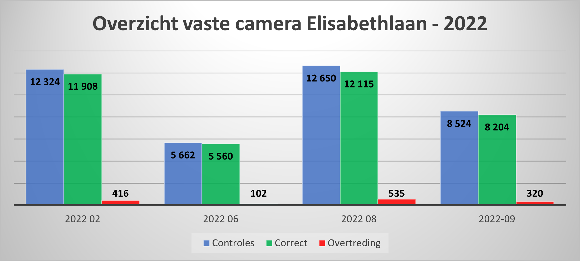 Aan de vaste flitscamera op de Elisabethlaan passeerden 8.524 voertuigen. Daar zijn maar 320 overtredingen (3,75 %) vastgesteld.