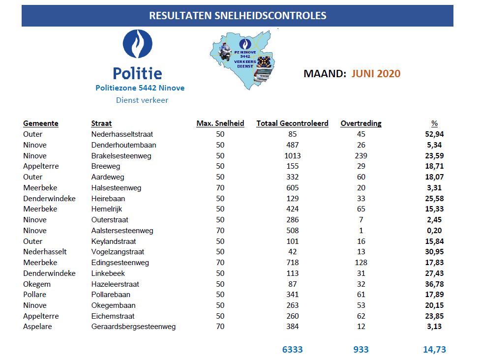 In juni zijn 6.333 voertuigen gecontroleerd met 933 overtredingen tot gevolg (14,73 %.).