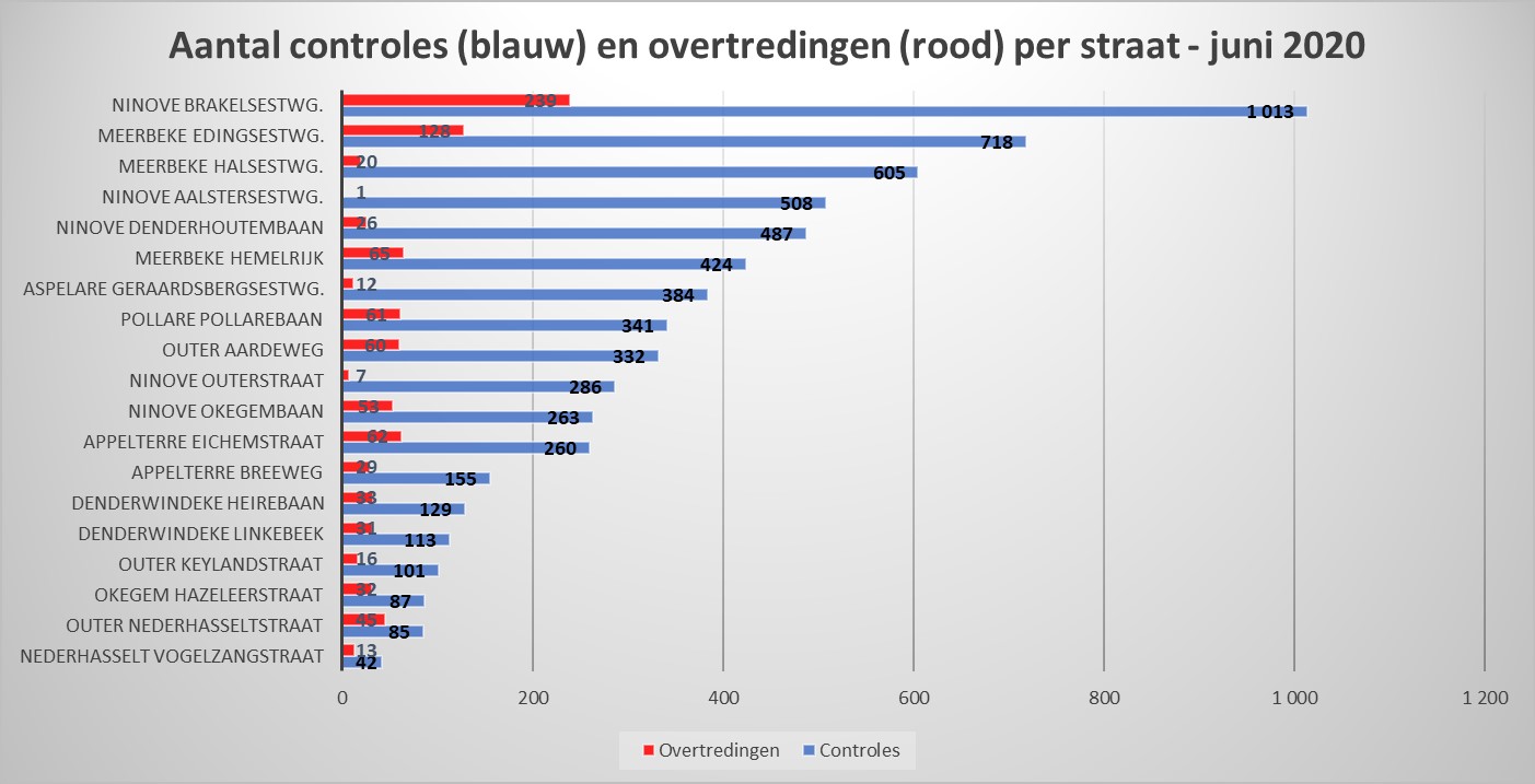 De laagste percentages overtredingen gebeurden op de Aalstersteenweg-Ninove (0.20 %), in de Outerstraat-Ninove (2.45 %) en op de Geraardsbergsesteenweg-Aspelare (3.13 %).