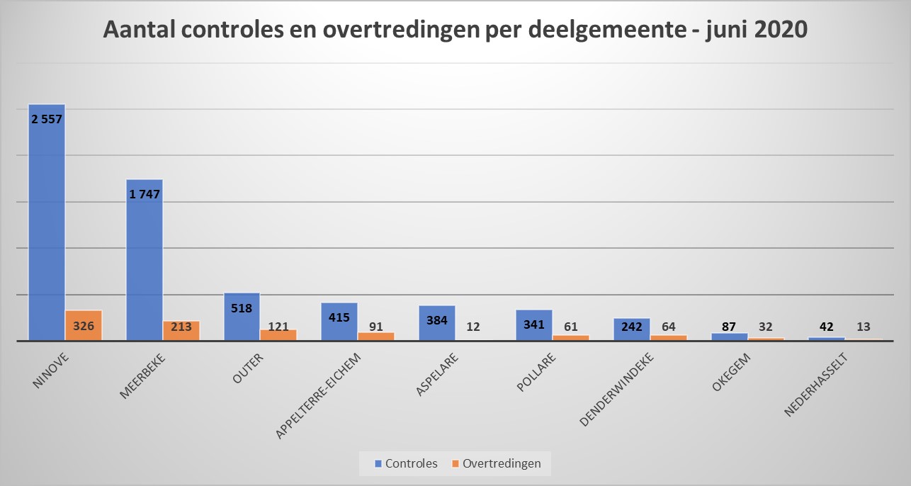 De meeste controles vonden plaats in Ninove (2.913), Meerbeke (1.747) en Outer (518); de minste in Nederhasselt (42), Okegem (87) en Denderwindeke (242).