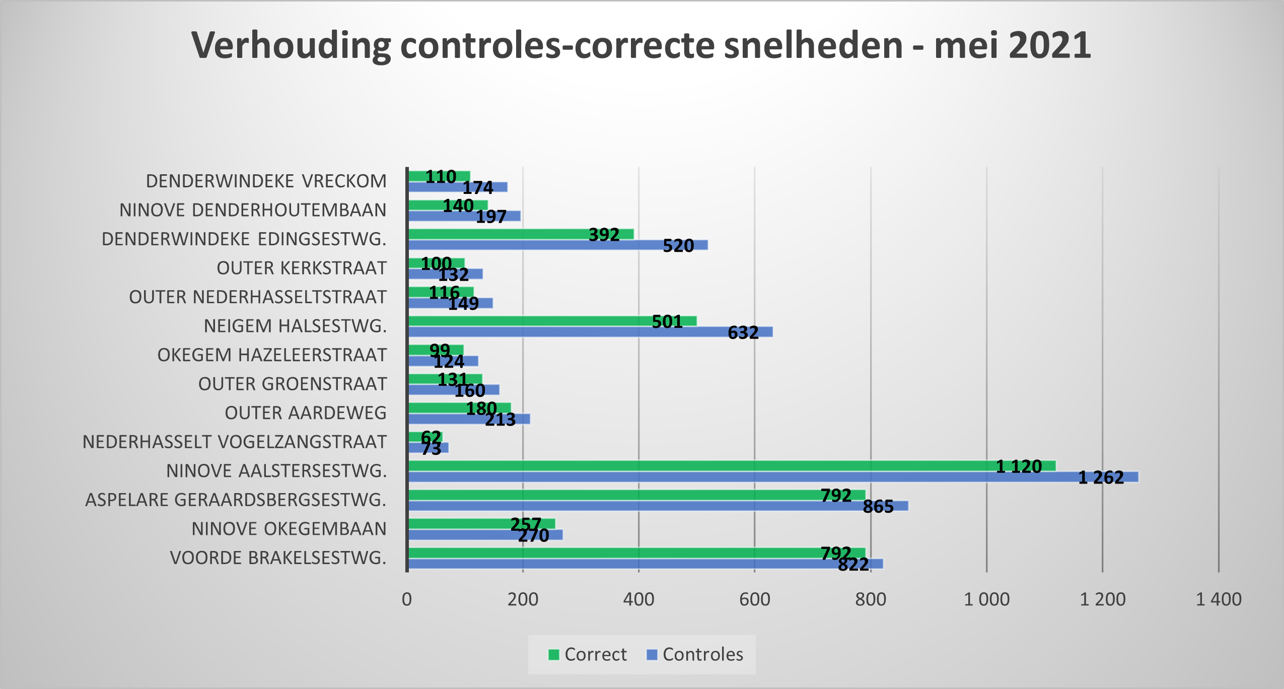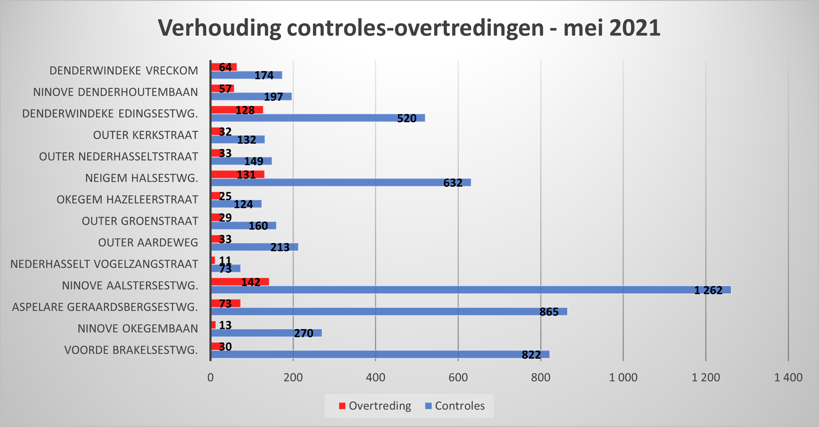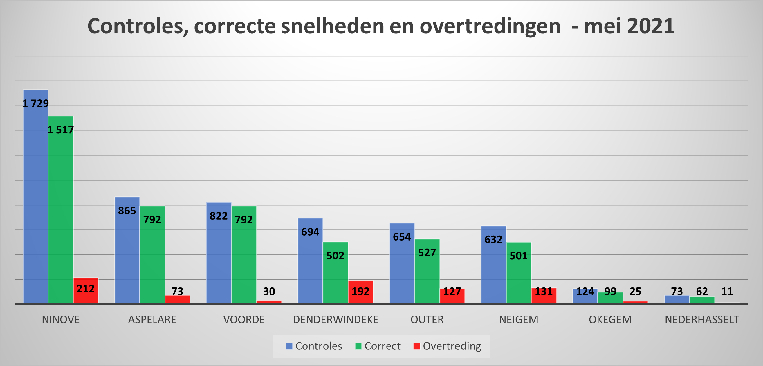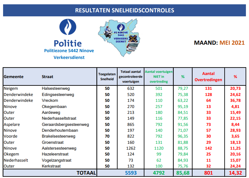 NINOVE – De lokale politie controleerde in mei 5.593 voertuigen op snelheid. 4.792 bestuurders (85,68 %) hielden zich aan de toegelaten snelheid. Dat was minder het geval op Vreckom in Denderwindeke, waar 36,78 % van de gecontroleerden te snel reed. In april was dat percentage ook al hoog: 33,10 %.