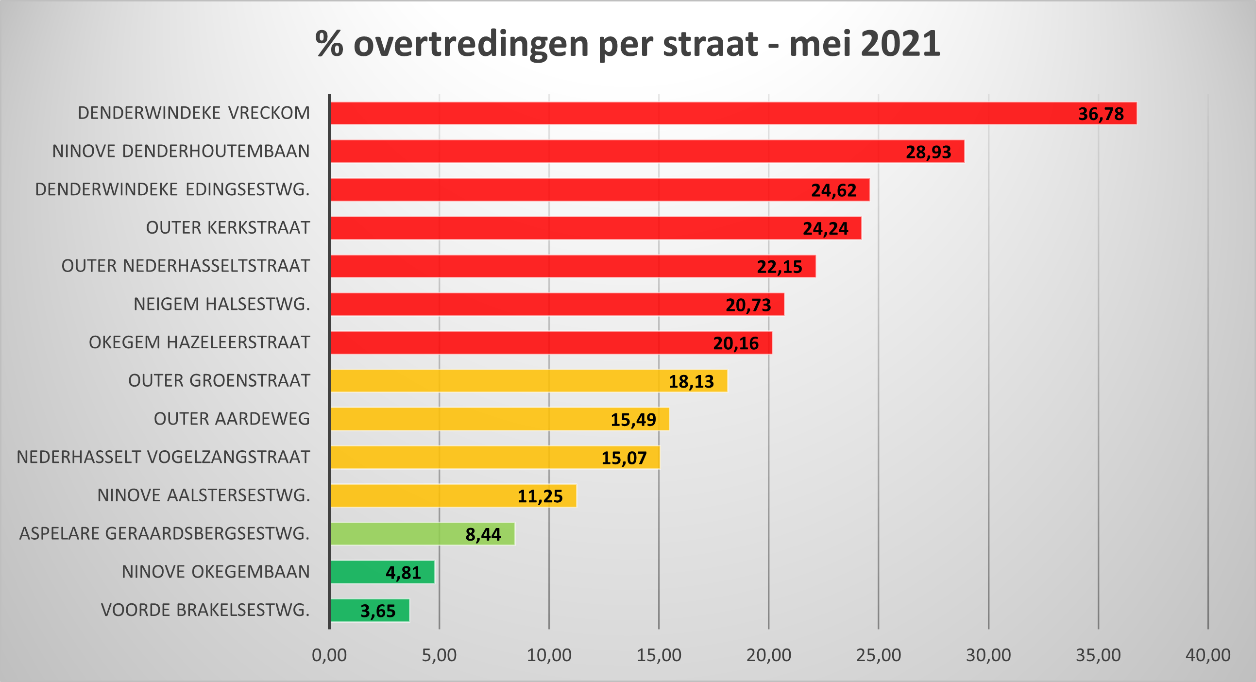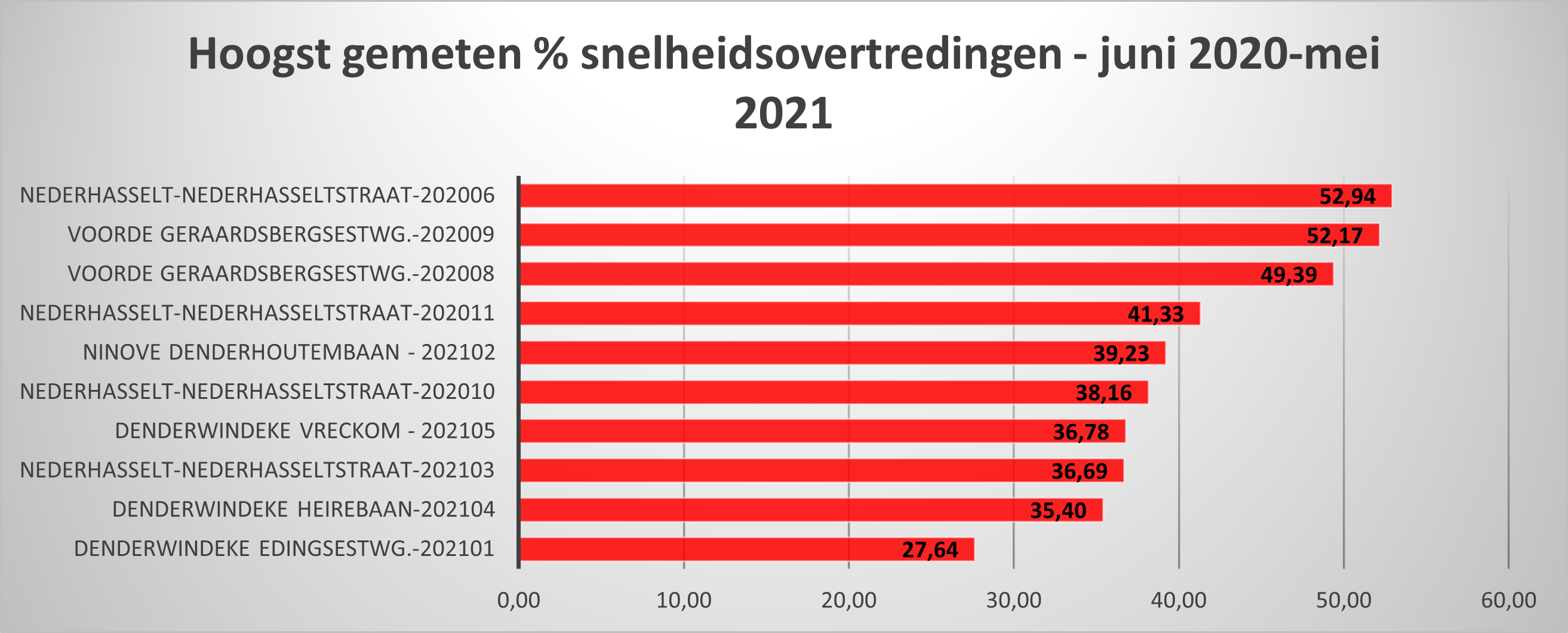 Daarnaast gebeurden nog hoge snelheidsovertredingen op twee ‘klassiekers’: de Denderhoutembaan in Ninove (28,93 %) en de Edingsesteenweg in Denderwindeke (24,62 %).
