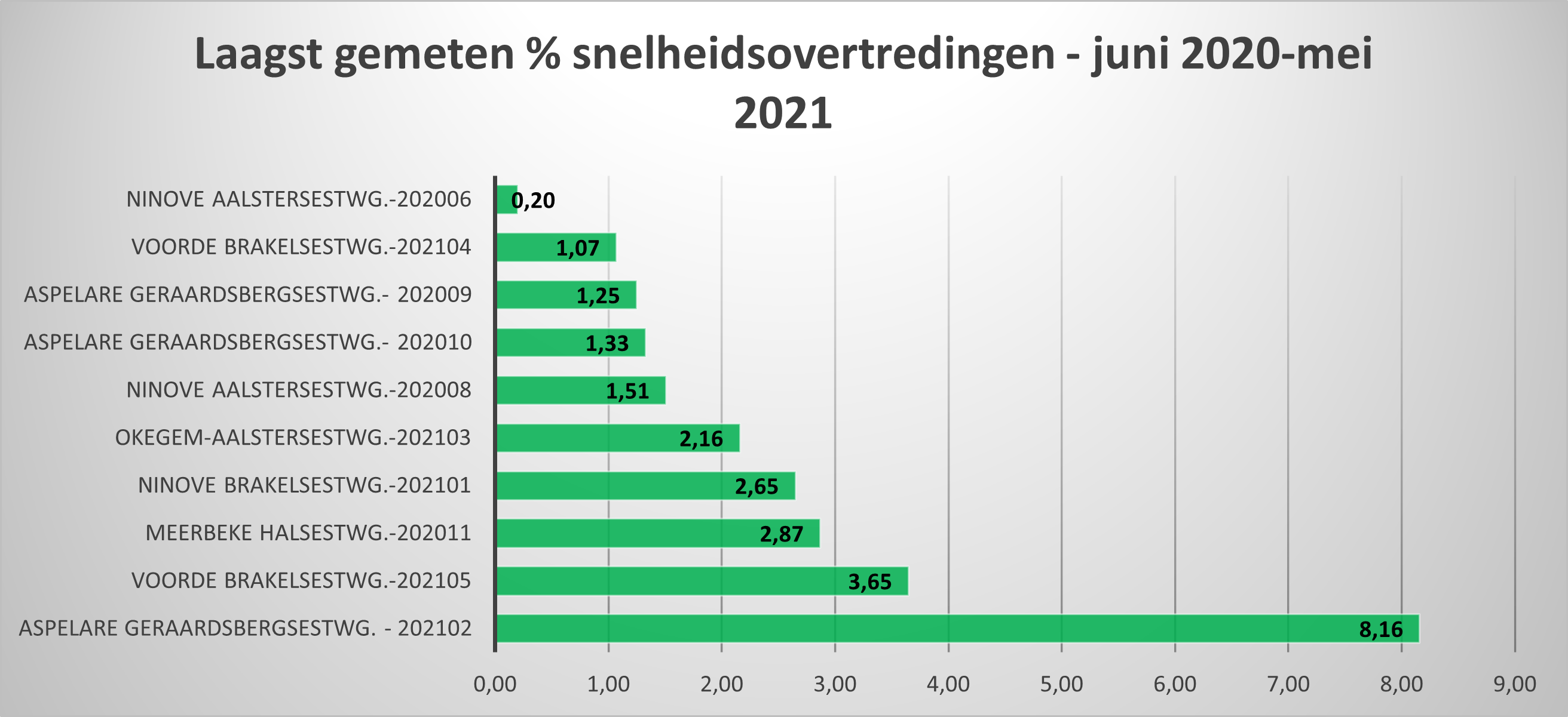 De lagere percentages zijn opgetekend op de Brakelsesteenweg in Voorde (3,65 %), de Okegembaan in Ninove (4,81 %) en de Geraardsbergsesteenweg in Aspelare (8,44 %).