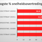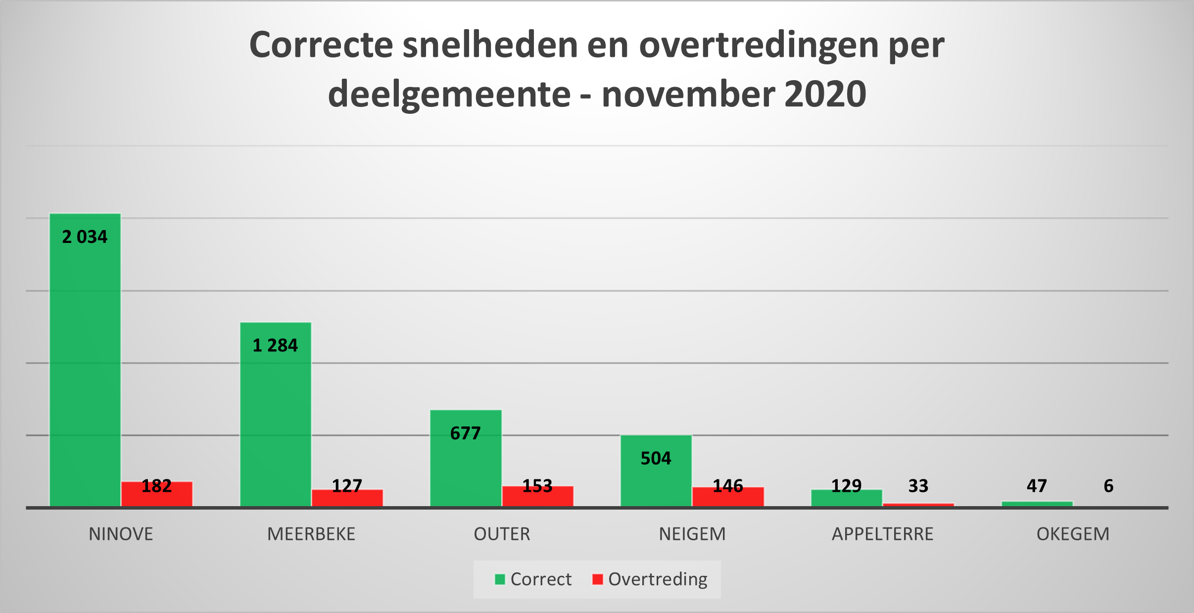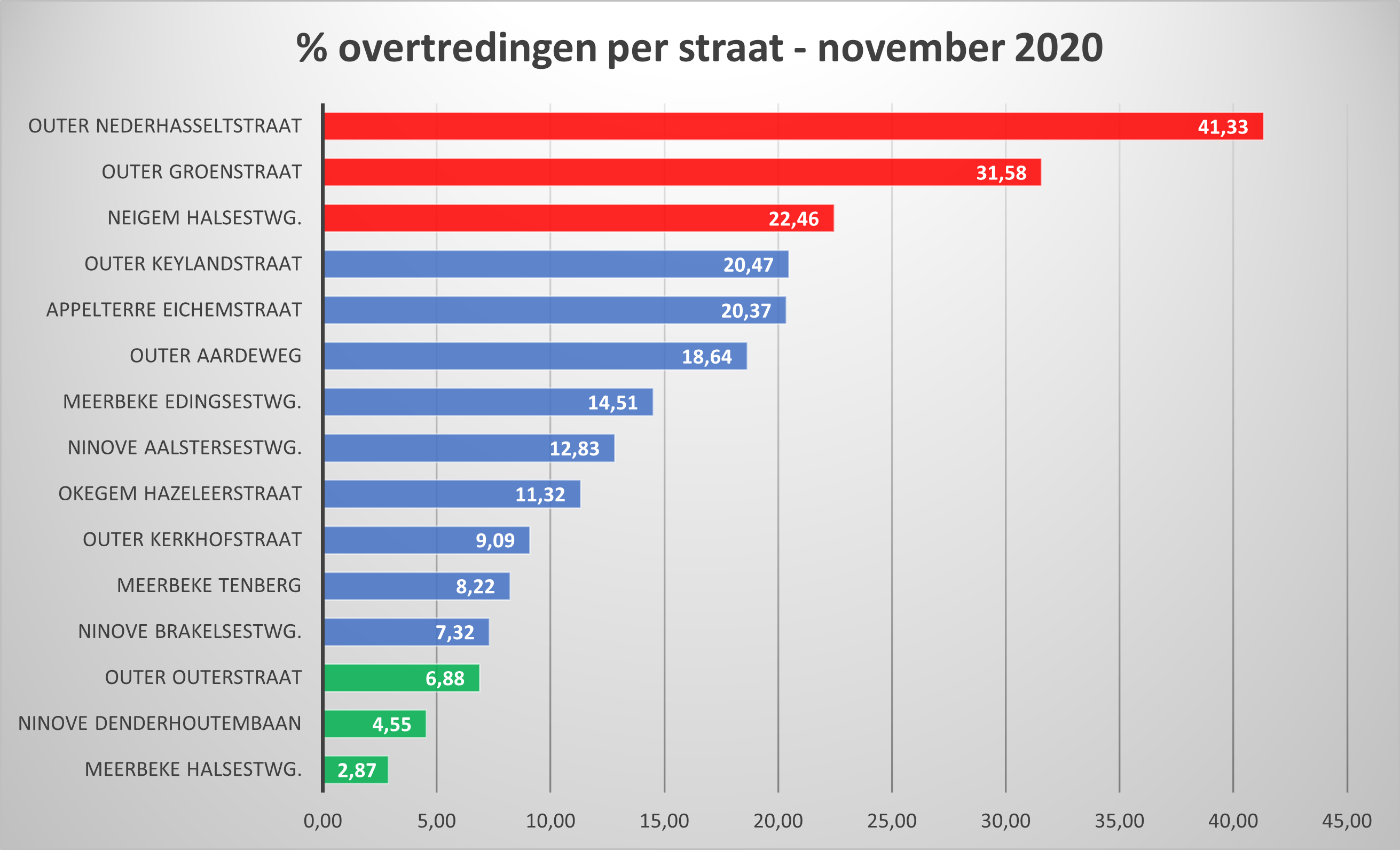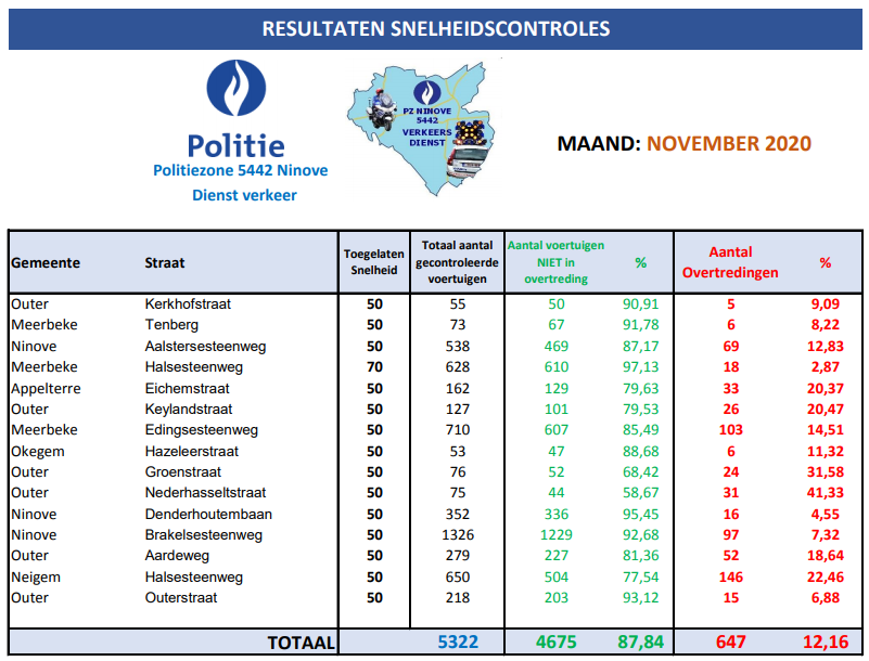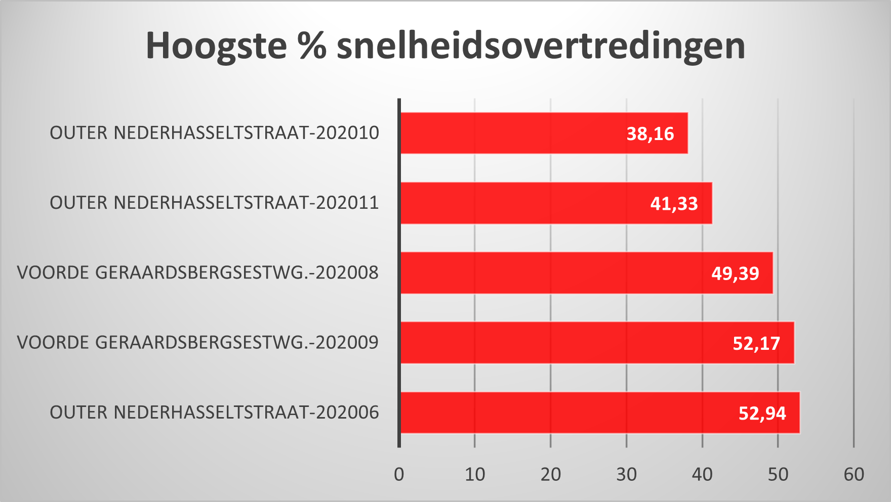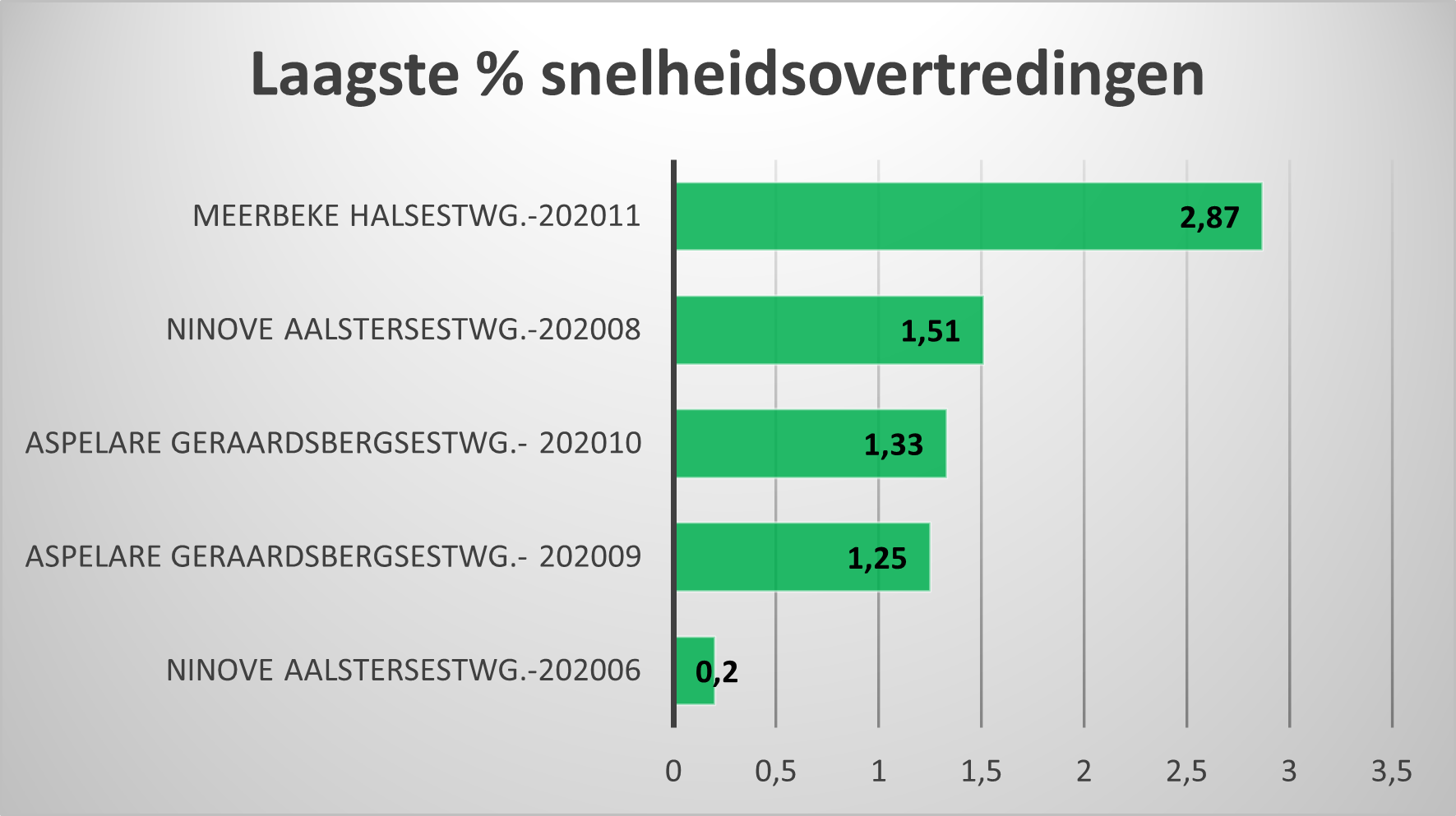 - De laagste percentages overtredingen gebeurden op de Halsesteenweg in Meerbeke (2,87 %), de Denderhoutembaan in Ninove (4,55 %) en de Outerstraat in Outer (6,88 %).