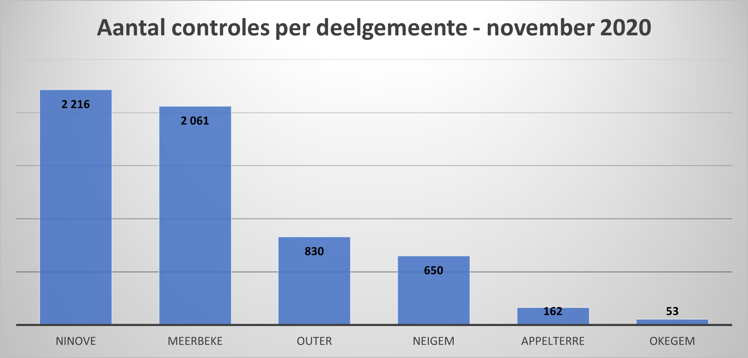 - De meeste controles vonden plaats Ninove (2.216), Meerbeke (2.061) en Outer (830). De minste gebeurden in Okegem (53), Appelterre-Eichem (162) en Neigem (650).