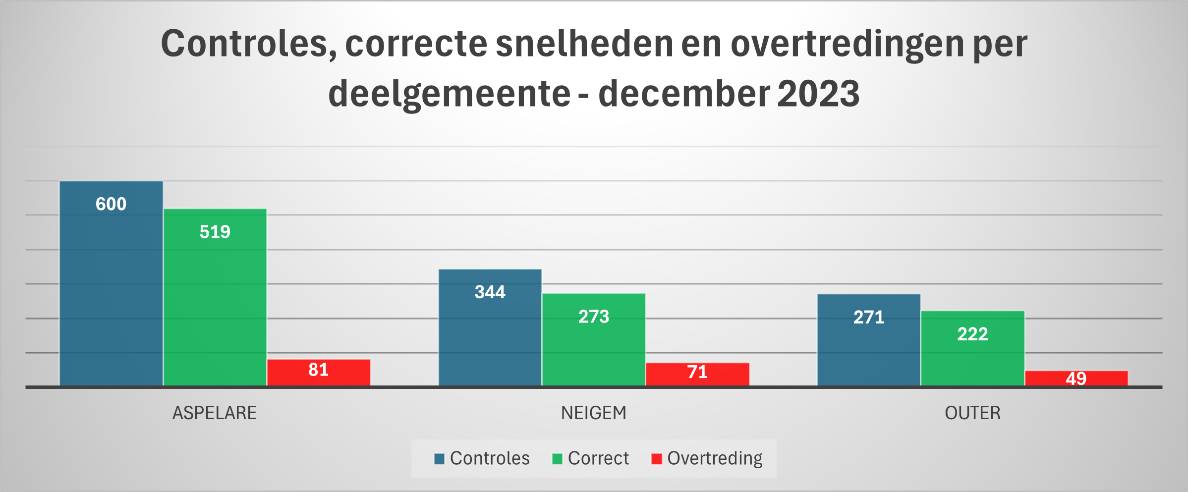 De bemande camera’s controleerden in december 1.215 voertuigen. 1.014 chauffeurs (83,46 %) hielden zich aan de toegelaten snelheid van 50 km/uur. De controles beperkten zich tot Aspelare, Neigem en Outer.