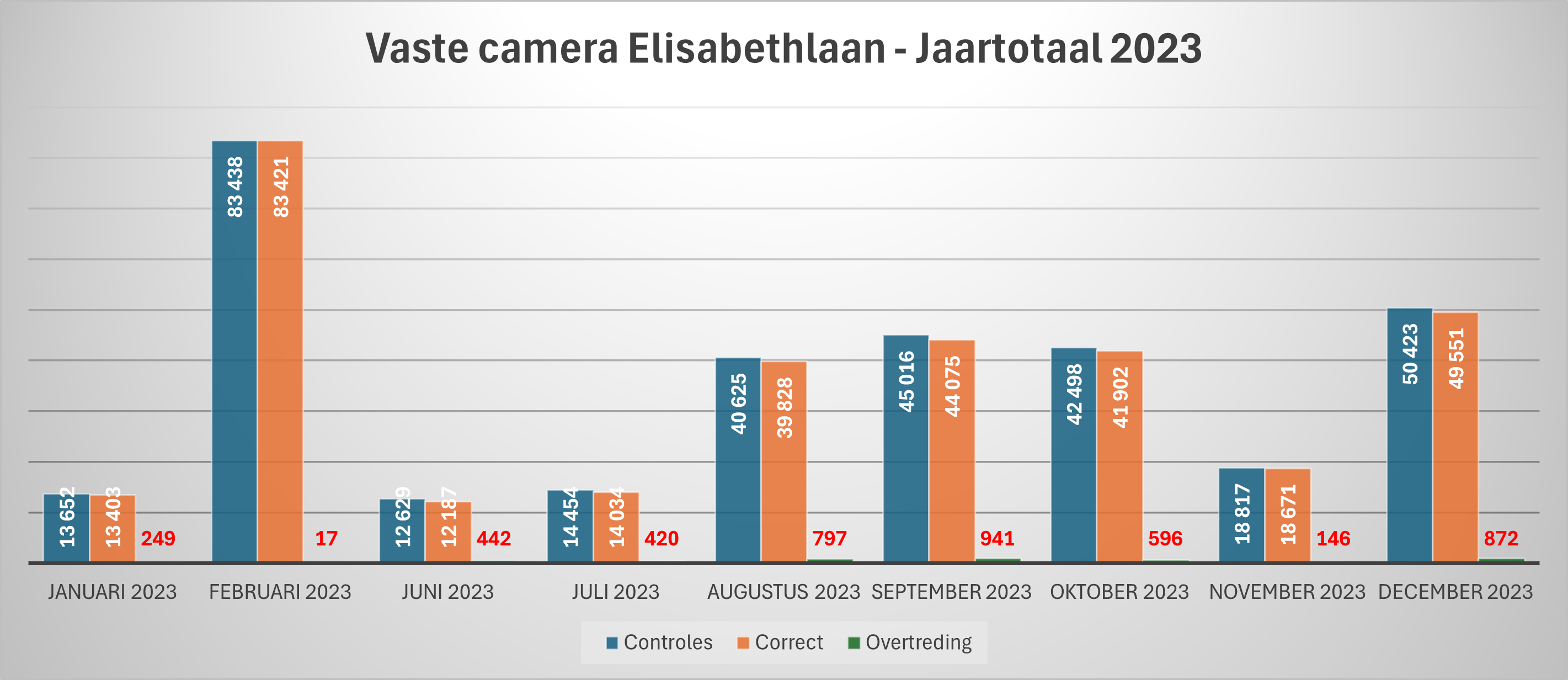 Aan de vaste camera op de Elilsabethlaan reden vorige maand 50.423 voertuigen voorbij en zijn 872 overtredingen (1,73 %) vastgesteld.