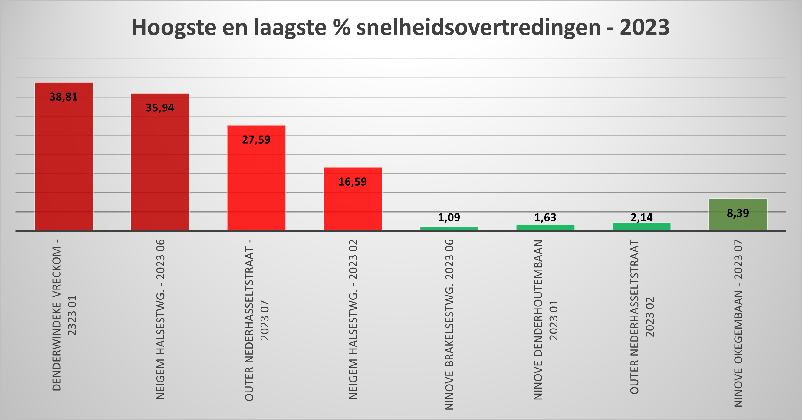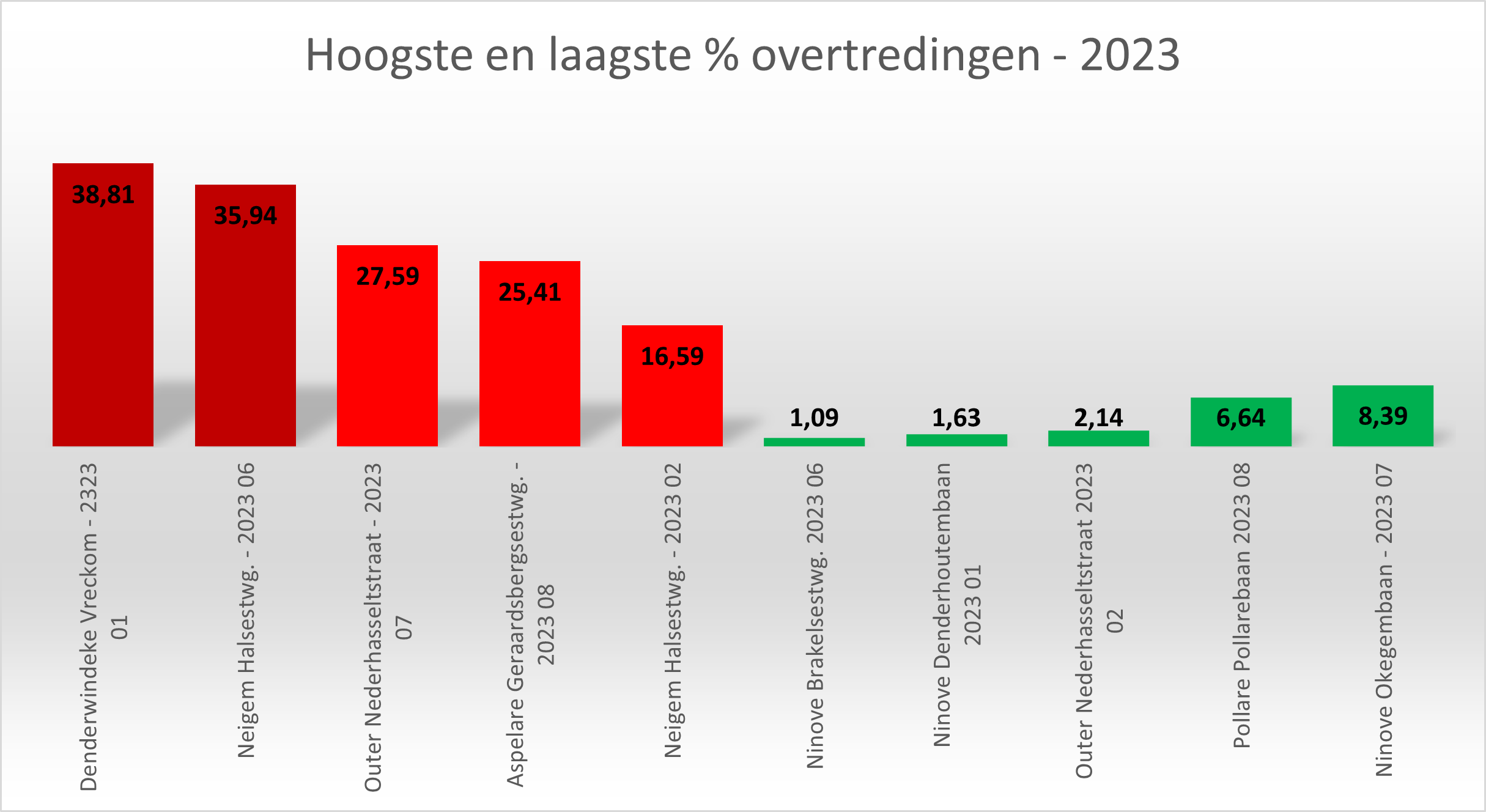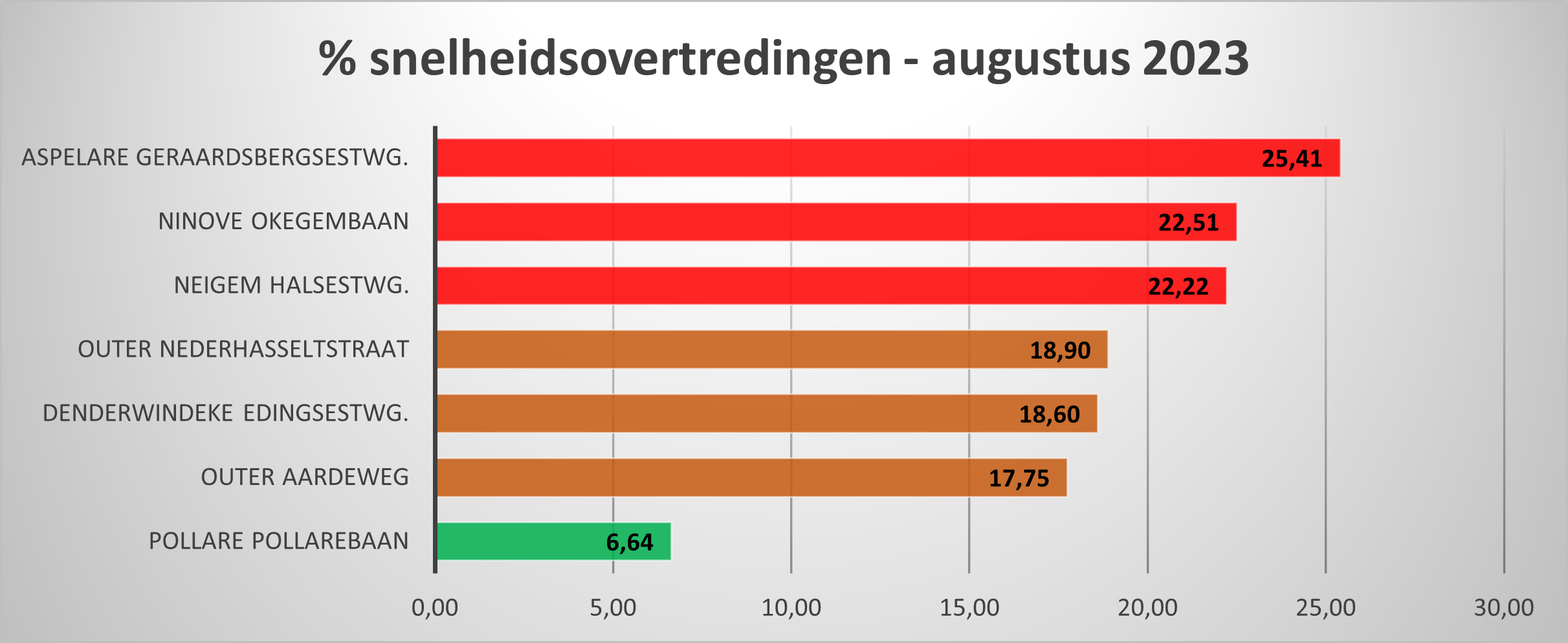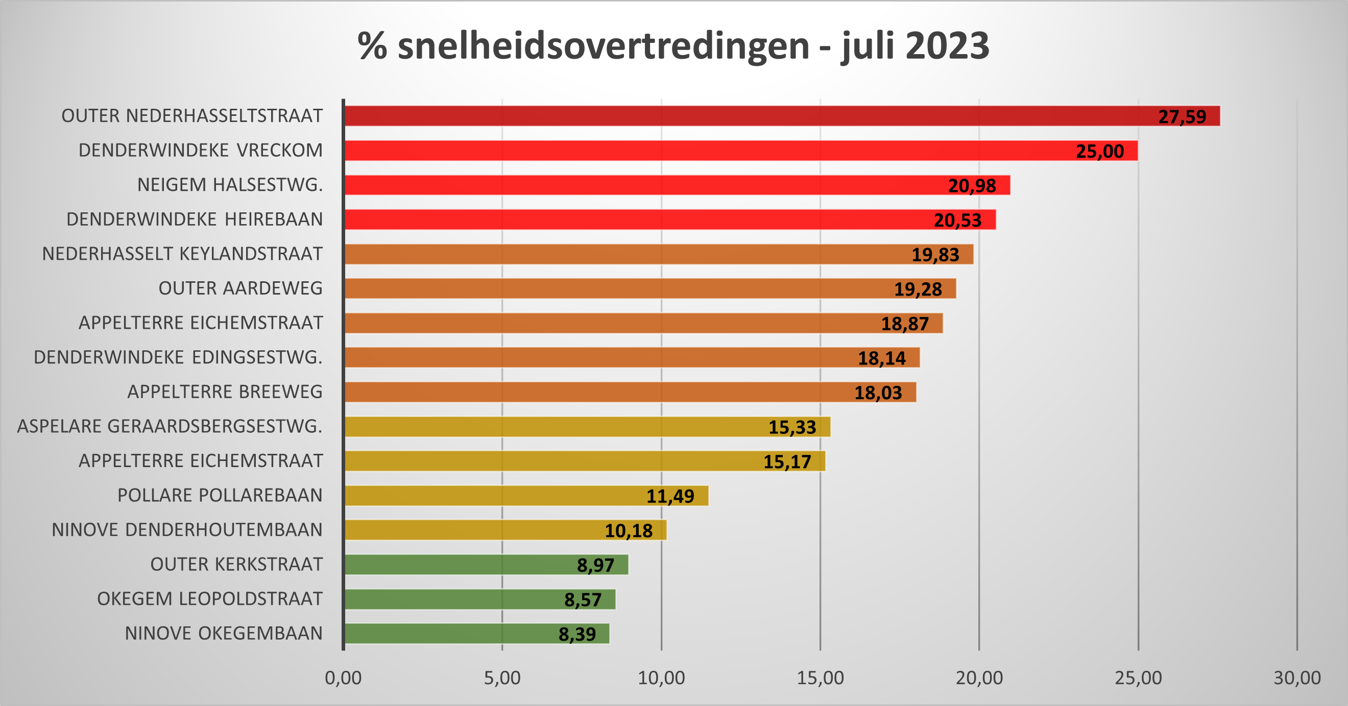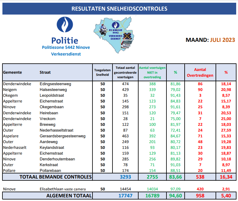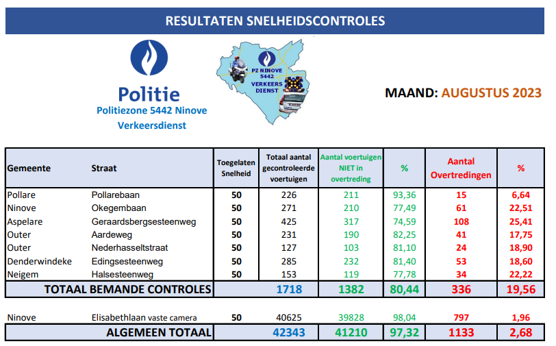 NINOVE – De verkeerseenheid van de lokale politie maakte de cijfers bekend van de snelheidscontroles in juli en augustus. In de Nederhasseltstraat(Outer) en op de Geraardsbergsesteenweg (Aspelare) zijn de hoogste percentages aan overtredingen genoteerd: respectievelijk 27,59 % en 25,41 %.