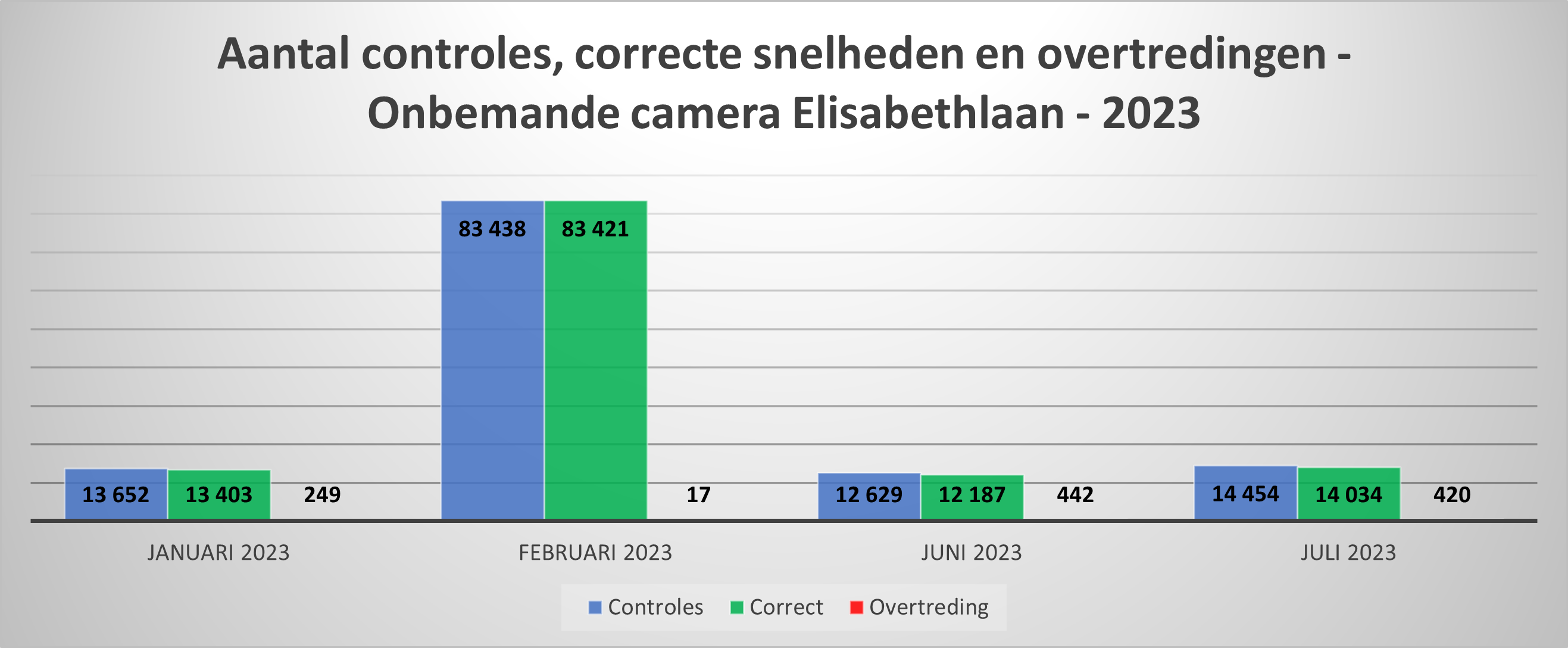 Aan de vaste flitscamera op de Elisabethlaan passeerden 40.625 voertuigen, met 797 (1,96 %) overtredingen tot gevolg.