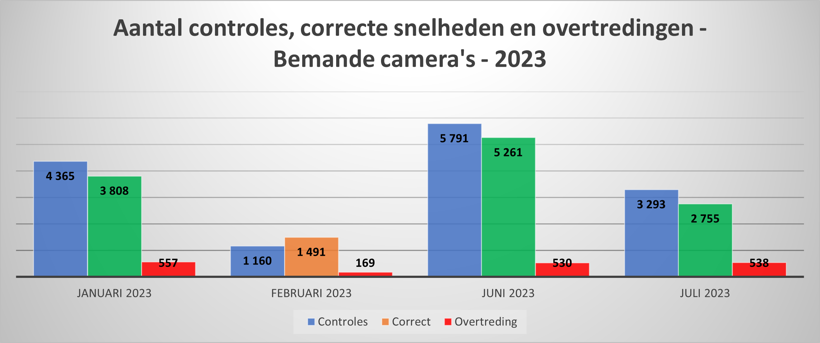 De snelheidscontrole met bemande camera waren beperkter: 1.718 voertuigen zijn gecontroleerd, 1.382 bestuurders (80,44 %) hielden zich aan de toegelaten snelheid van 50 km/uur.