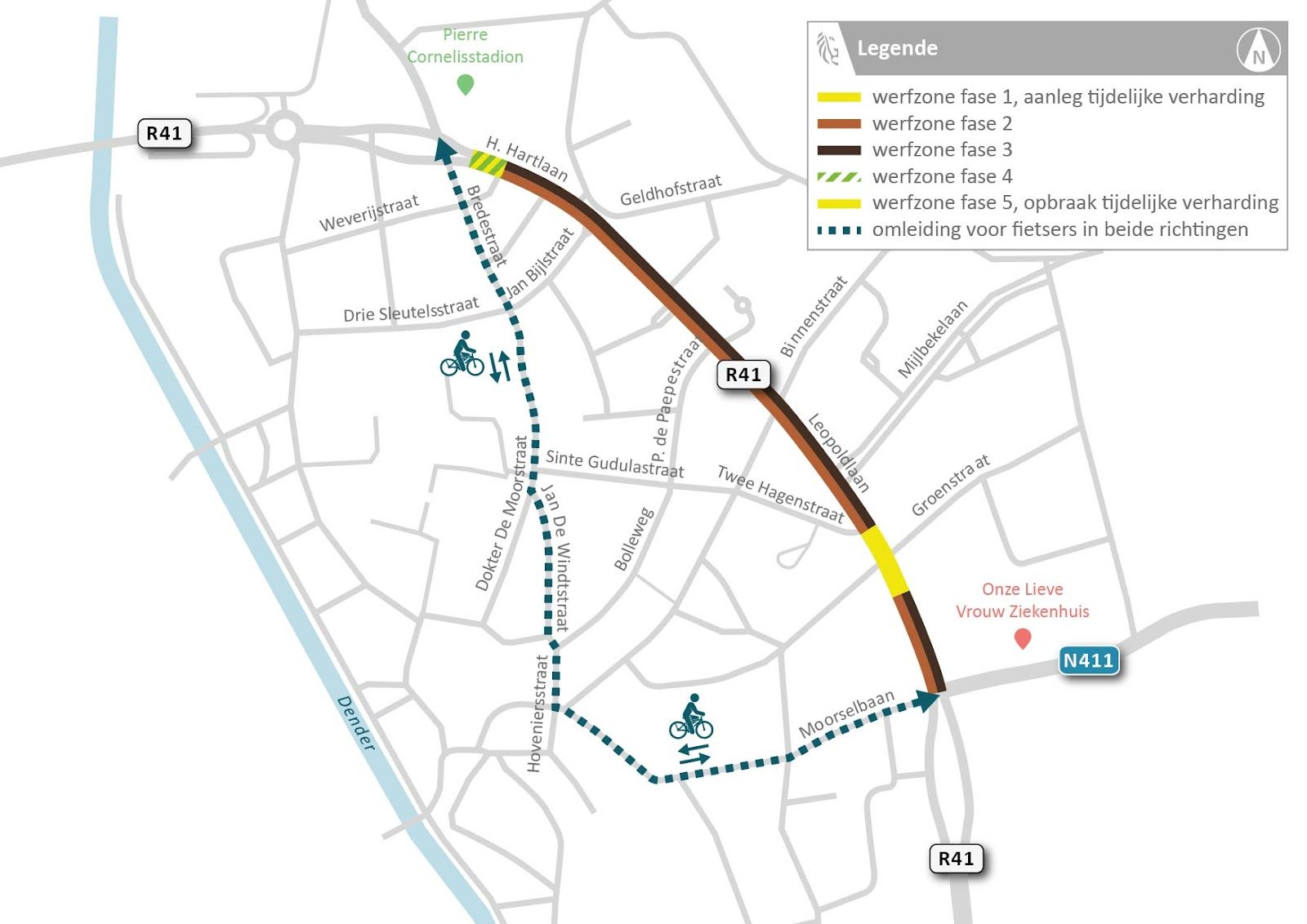 - Fietsers rijden in beide richtingen om via de Bredestraat, de Dokter De Moorstraat, Jan de Windtstraat, de Hoveniersstraat en de Moorselbaan (N411).