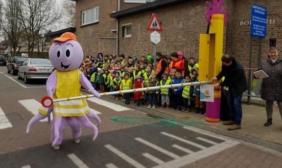 “Via de opzichters kunnen de kinderen mee met de rij naar het Gemeenteplein of de Nieuwstraat. Daar zijn voldoende veilige parkeerplaatsen. Wij vragen om een octopuspaal met een uitschuifbare bareel te plaatsen aan het begin van deze eenrichtingsstraat. Deze moet ervoor zorgen, dat zo weinig mogelijk (vracht)wagens de stoet kinderen hinderen, die te voet via het Berlindisstraatje van en naar school komen. De opzichters kunnen deze gemakkelijk en eenvoudig in- en uitschuiven.”