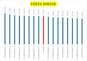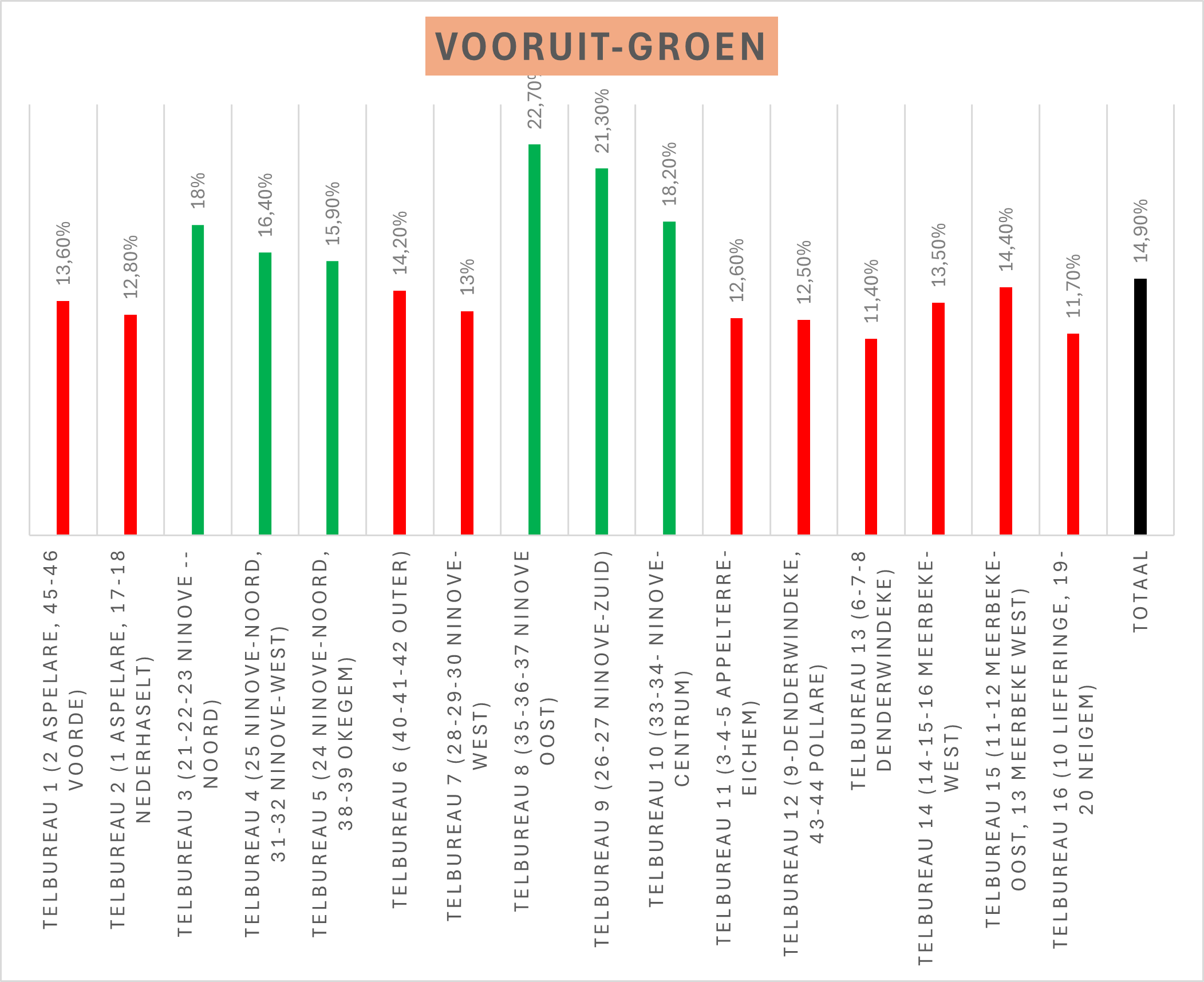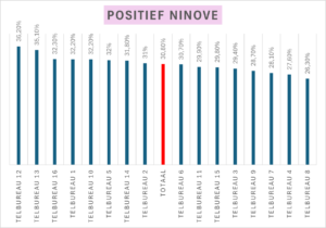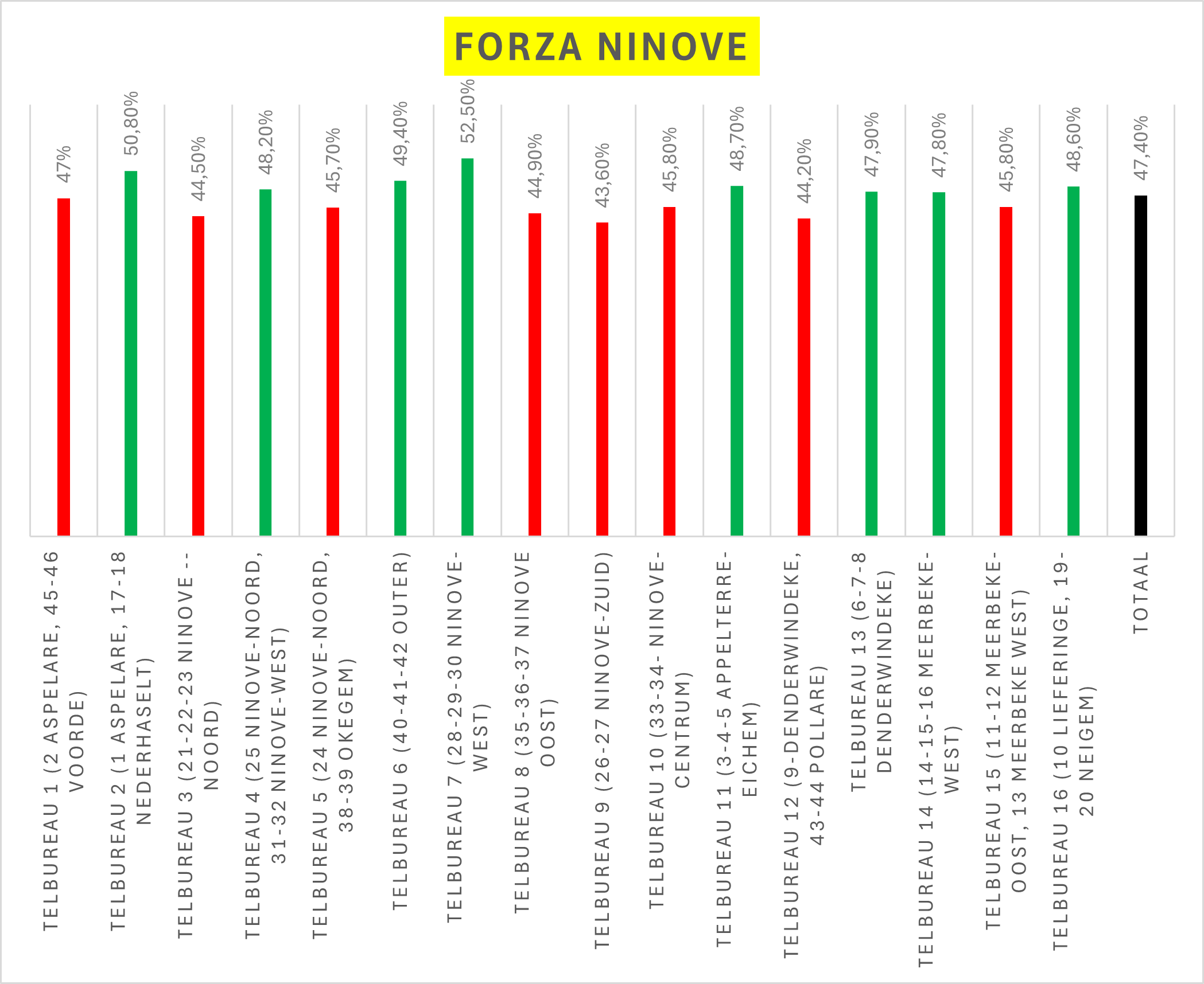 - In de andere 8 telbureaus liggen de resultaten onder het gemiddelde, onder meer in Ninove-Zuid (43,6 %), Denderwindeke-Pollare (44,2 %) en Ninove-Noord (44,5 %).