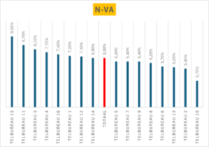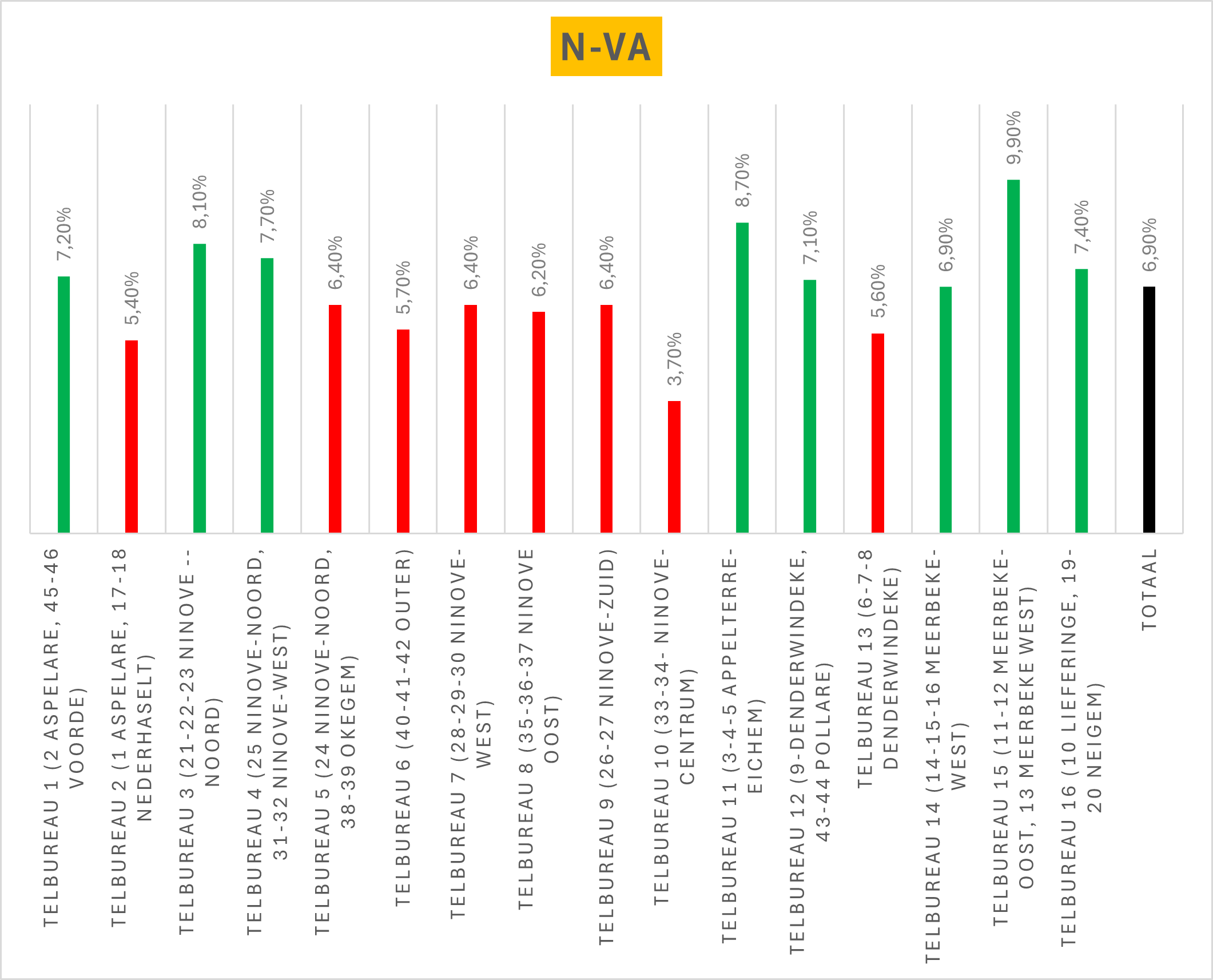 - De partij zit in de helft van de 16 telbureaus met een hogere score dan gemiddeld, onder meer in Outer (49,4 %), Aspelare-Nederhasselt (50,8 %) en Ninove-West (52,5 %).