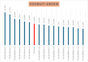 - De partij scoort in de helft van de telbureaus boven haar gemiddelde, vooral in Meerbeke-Oost-West (9,9 %), Appelterre-Eichem (8,7 %) en Ninove-Noord (8,1 %).