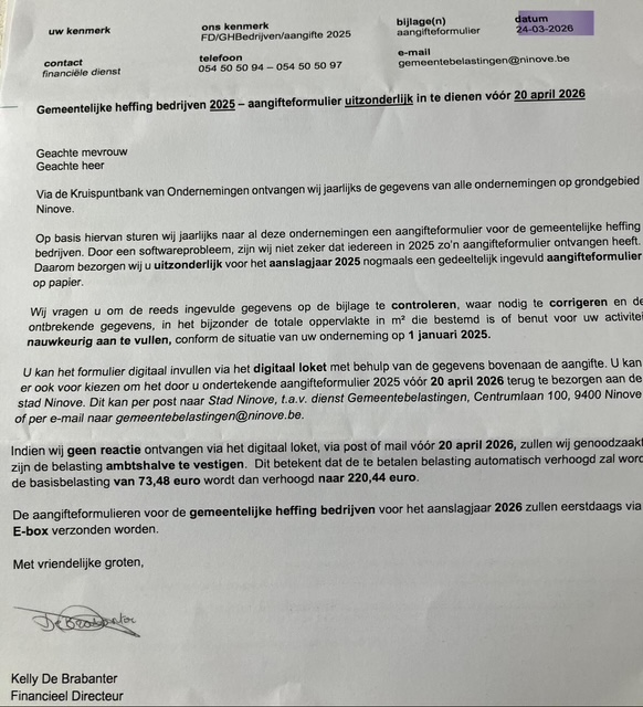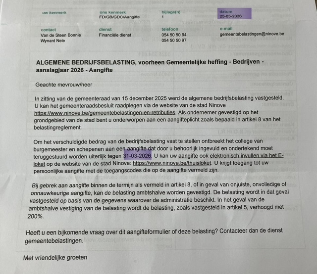 NINOVE – Tal van lokale ondernemers in Ninove zijn de afgelopen dagen opgeschrikt door brieven van de stad over de bedrijfsbelasting. De communicatie, die pas eind maart in de bus viel, eiste een aangifte tegen 31 maart, wat bij velen voor paniek en onbegrip zorgde. De stad laat echter weten dat de soep niet zo heet gegeten wordt als ze wordt opgediend en belooft respijt.