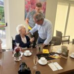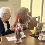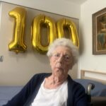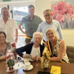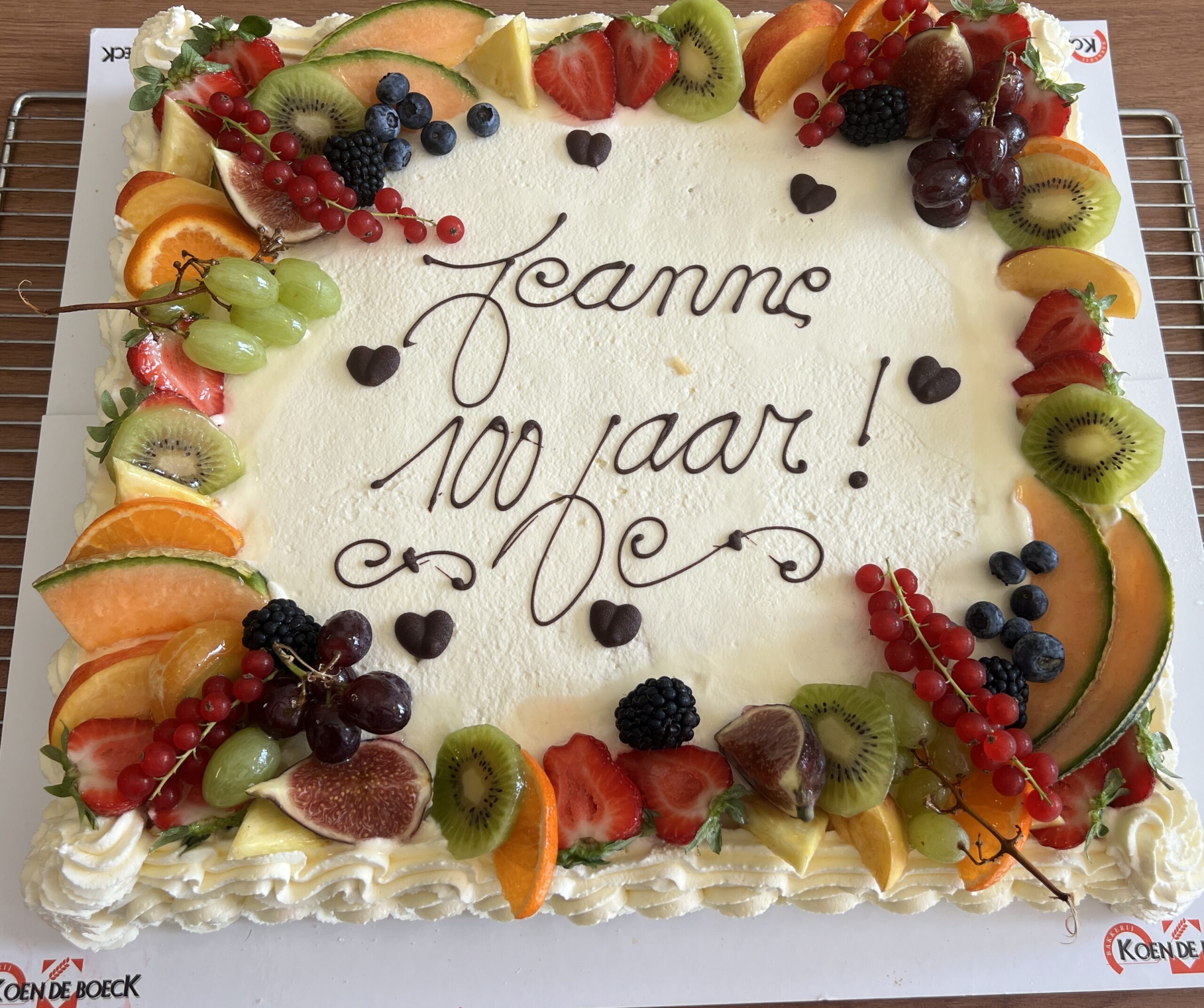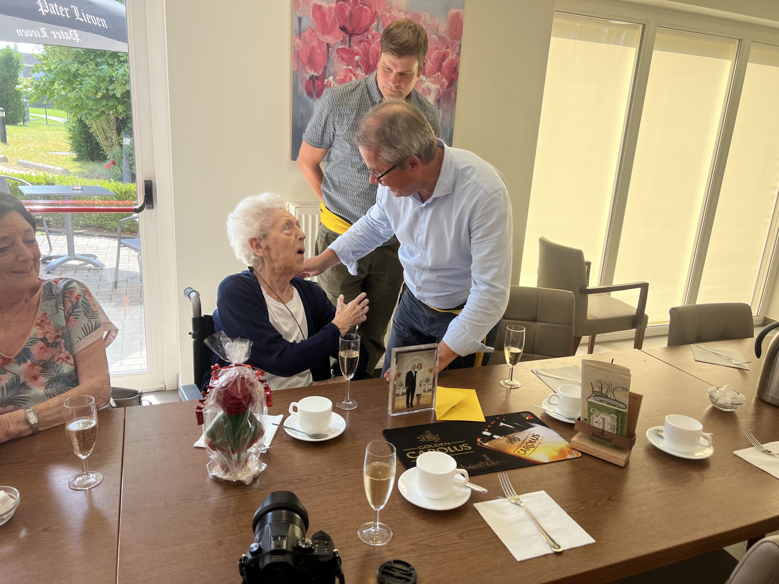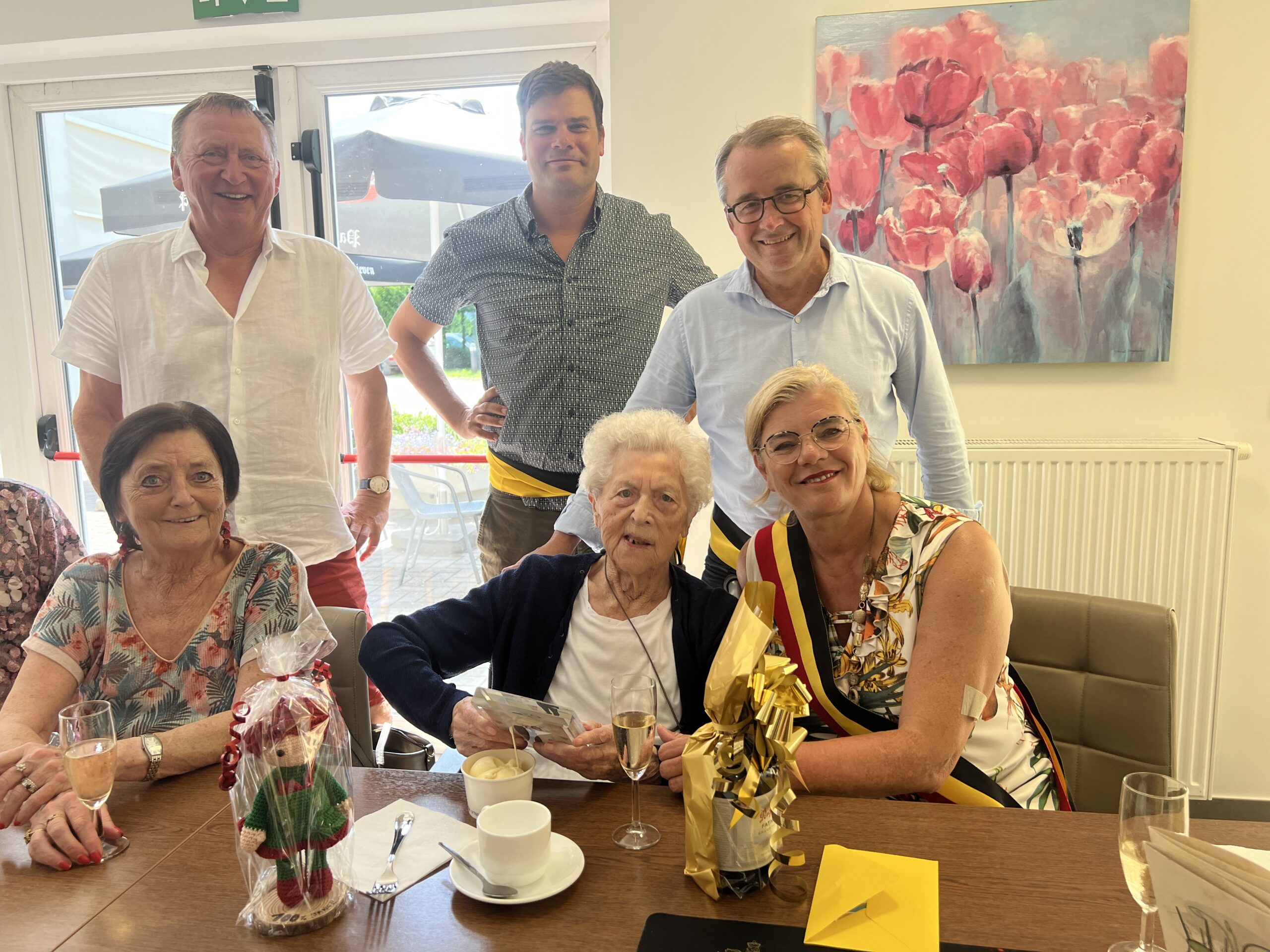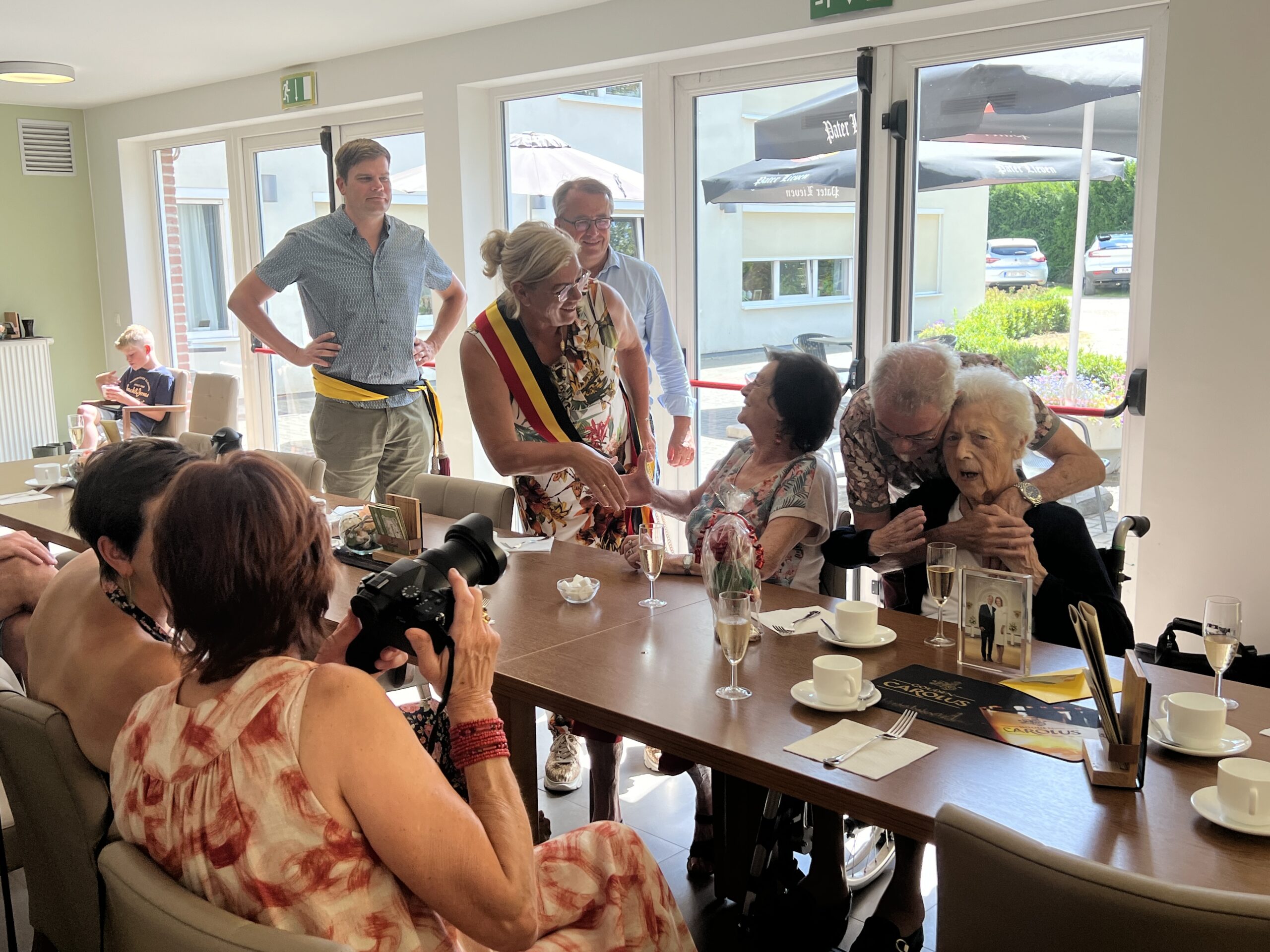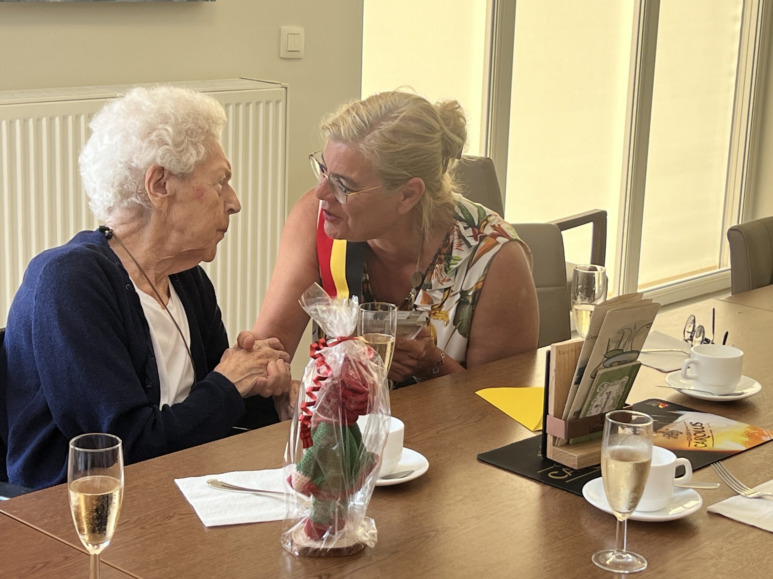 We sloten ons aan bij de vele gelukwensen, die Jeanne kreeg van familie en vrienden ter gelegenheid van haar honderdste verjaardag en mochten aanschuiven voor een lekker stuk taart. Ze kreeg ook de officiële geschenken vanwege het Ninoofse stadsbestuur, haar aangeboden door burgemeester Tania De Jonge en de schepen Henri Evenepoel en Stijn Vermassen.