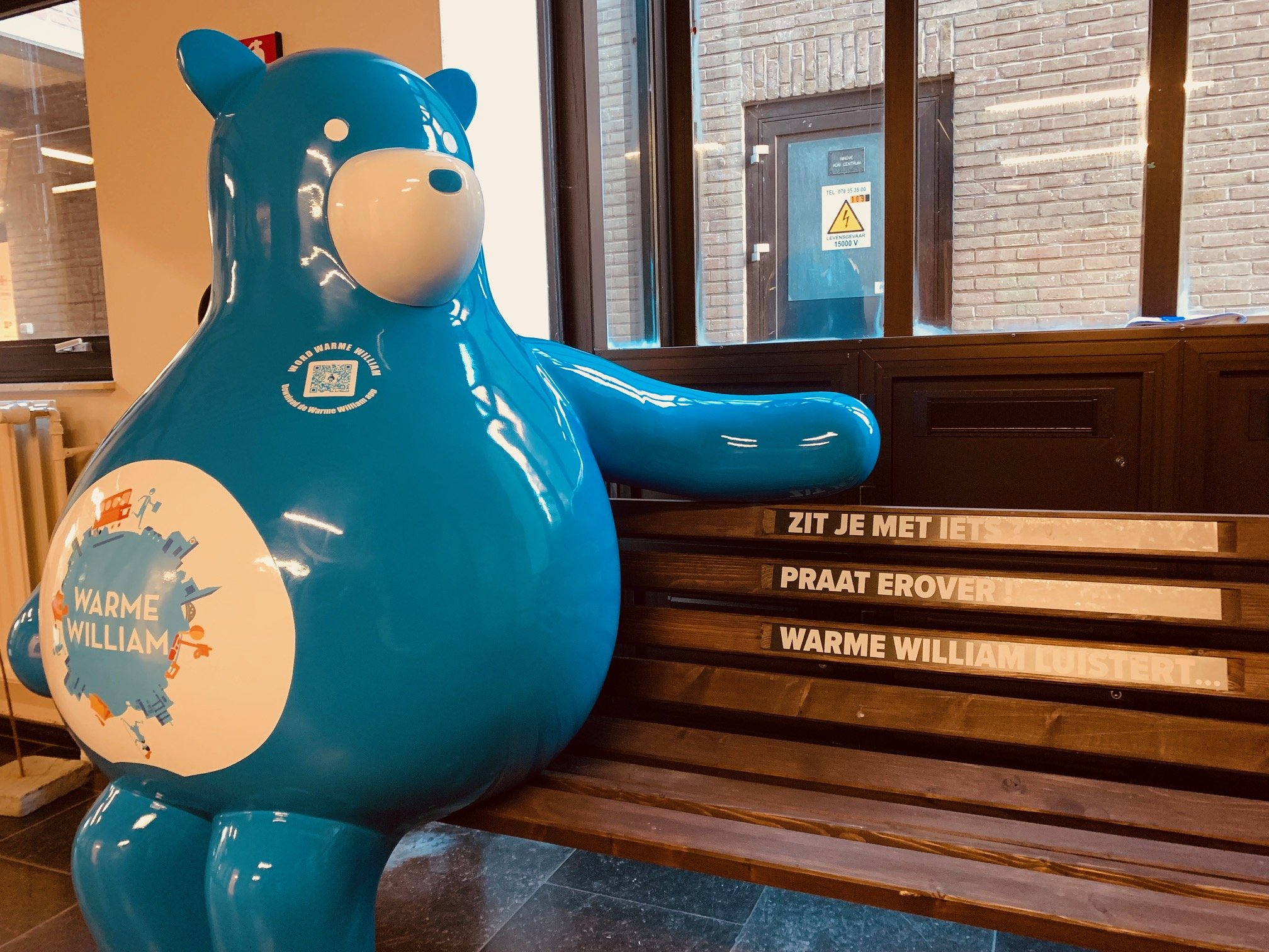 Warme William is een grote blauwe beer. Hij zit in het Fedimogebouw op een bankje waarop staat: ‘Zit je met iets? Praat erover. Warme William luistert.’