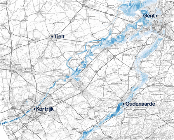 Het water van Leie en Bovenschelde komt samen in de Ringvaart rond Gent. Grote overstromingen zouden in Gent een potentiële schade in Gent veroorzaken tot € 3 miljard, in het 230 ml-scenario.