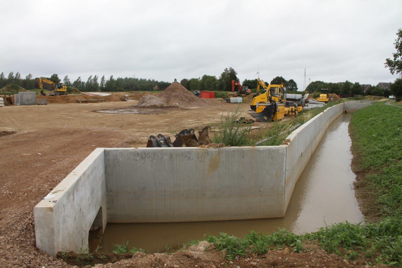 Rondom de site zijn de boordstenen aangebracht. Dat is ook het geval voor de fietspaden, die doorheen het volledige bedrijventerrein zullen lopen. Ook de ‘blusvijvers’ zijn gerealiseerd.