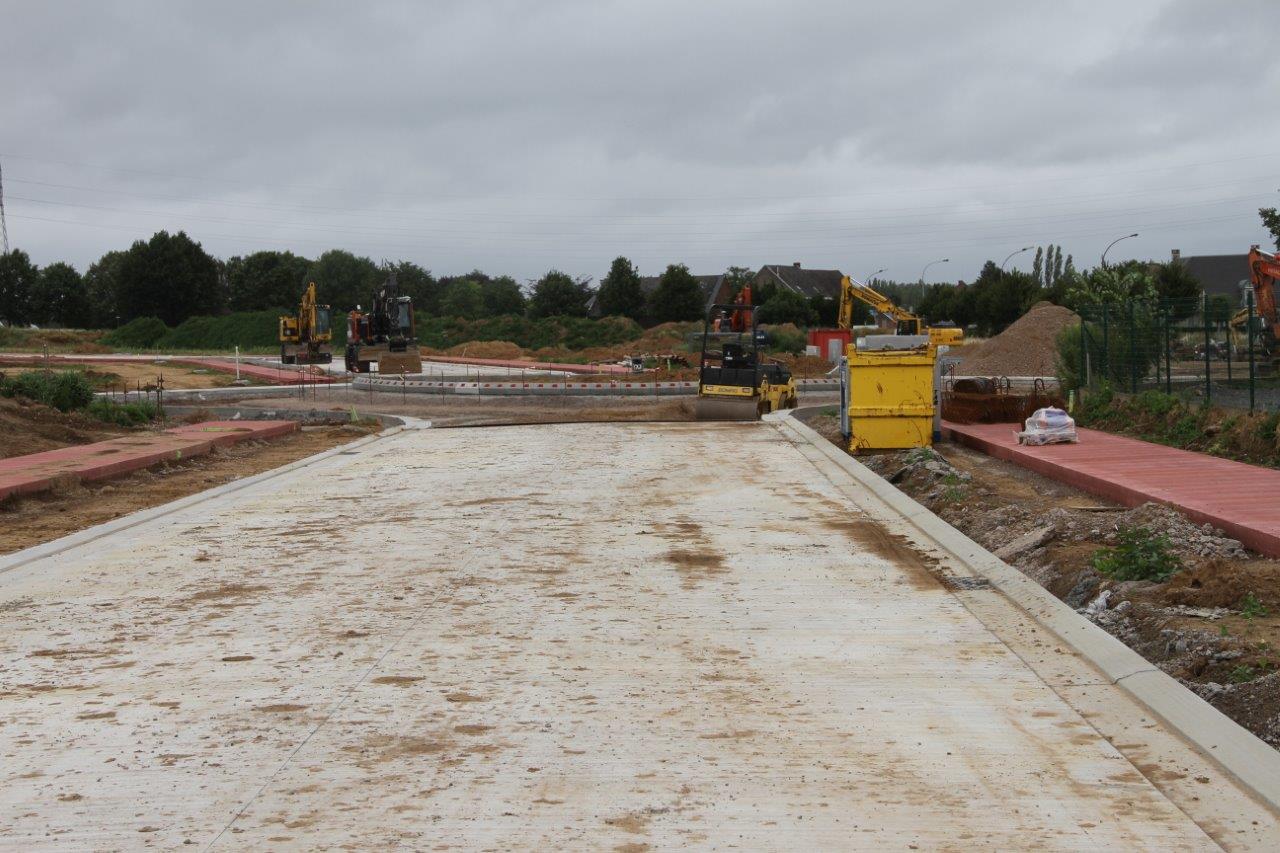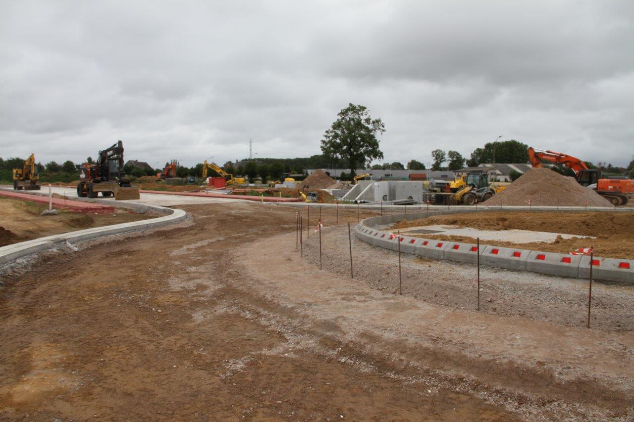 De aannemer is momenteel bezig met de rotonde aan het begin van het terrein. Ook de aanleg van de wegenis in beton schiet aardig op. Daardoor wordt de vorm van het terrein stilaan zichtbaar.
