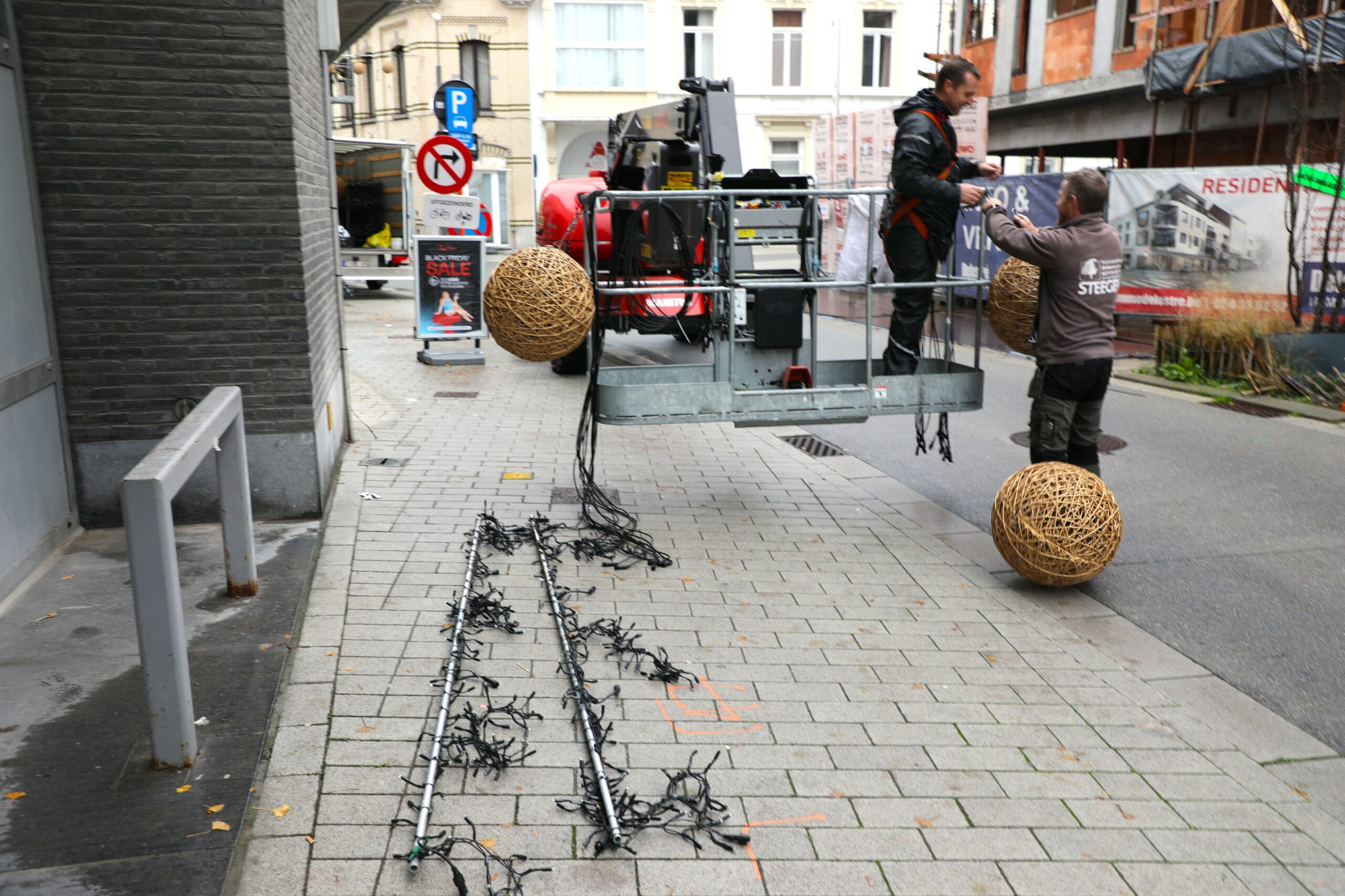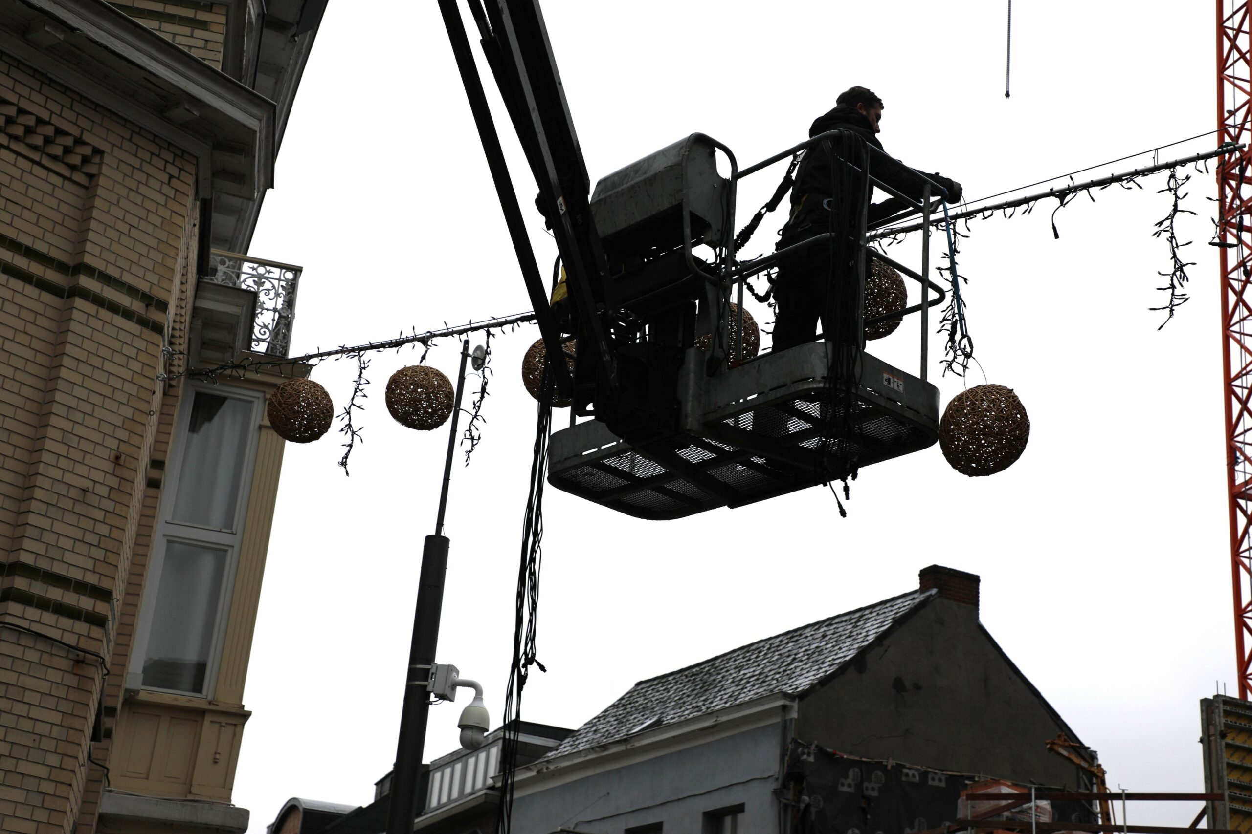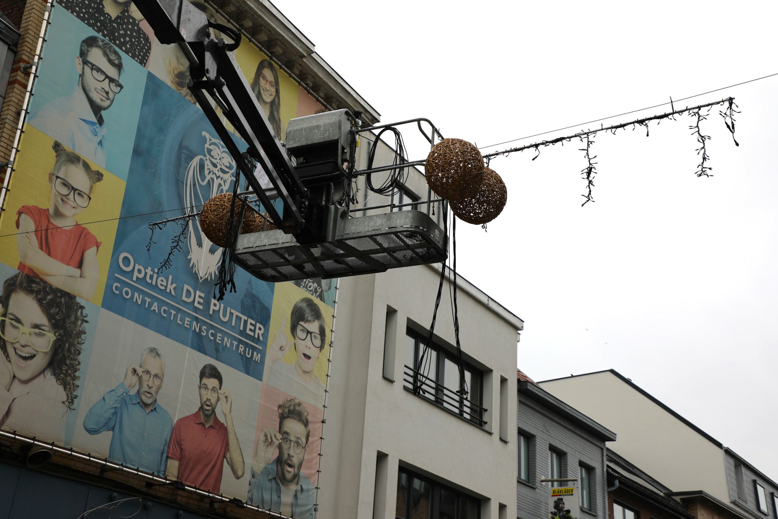 Zondagochtend gingen verschillende ploegen van start om deze klus te klaren. Het gaat om nieuwe, warme en sfeervolle ledverlichting met houten lichtbollen, die in de centrumstraten voor nog meer gezelligheid zal zorgen dan de voorgaande jaren.