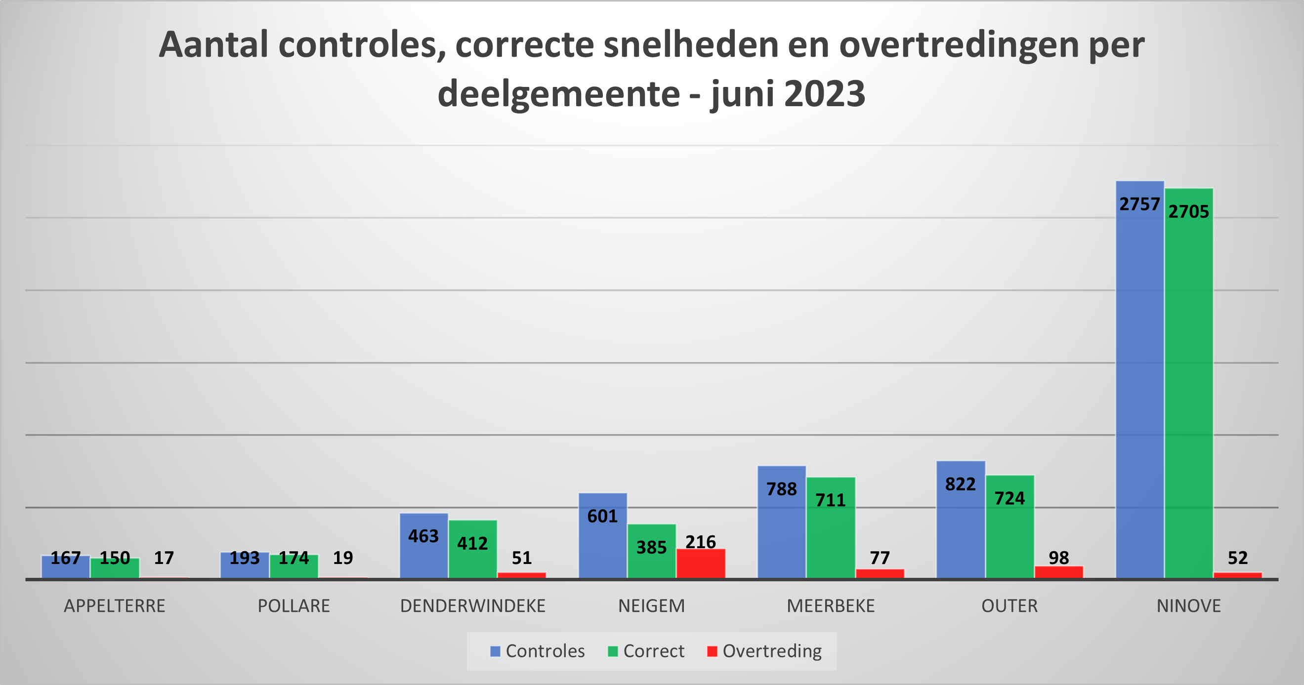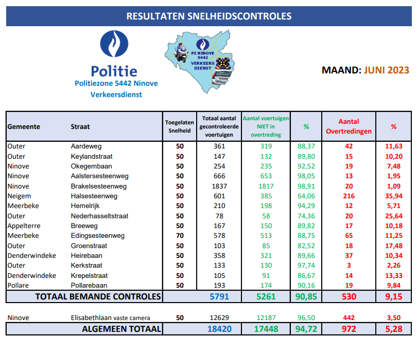 NINOVE – De lokale politie publiceerde het overzicht van de snelheidscontroles in juni. In Neigem is het hoogte percentage aan overtredingen vastgesteld. Het minste was dat op de Brakelsesteenweg.