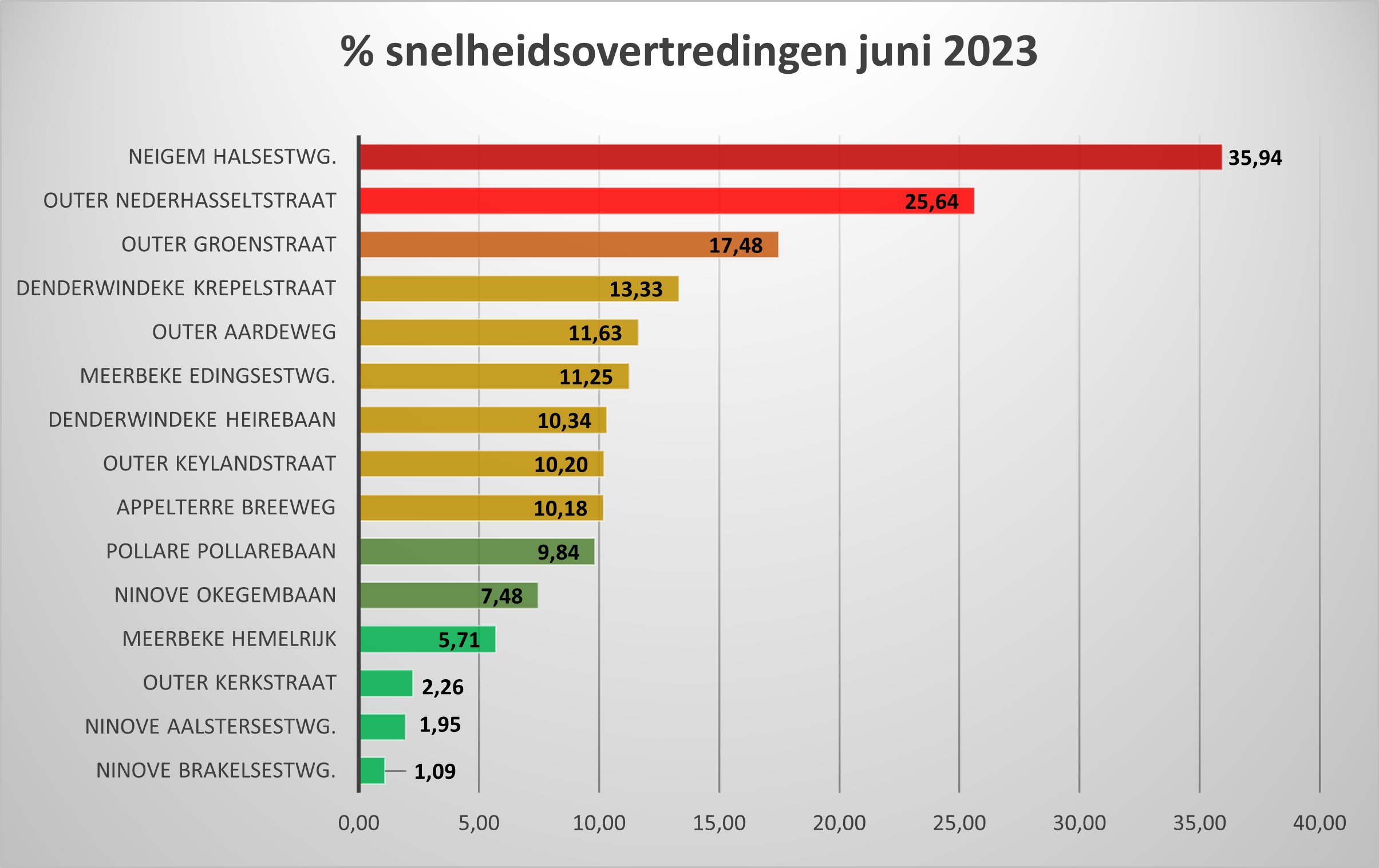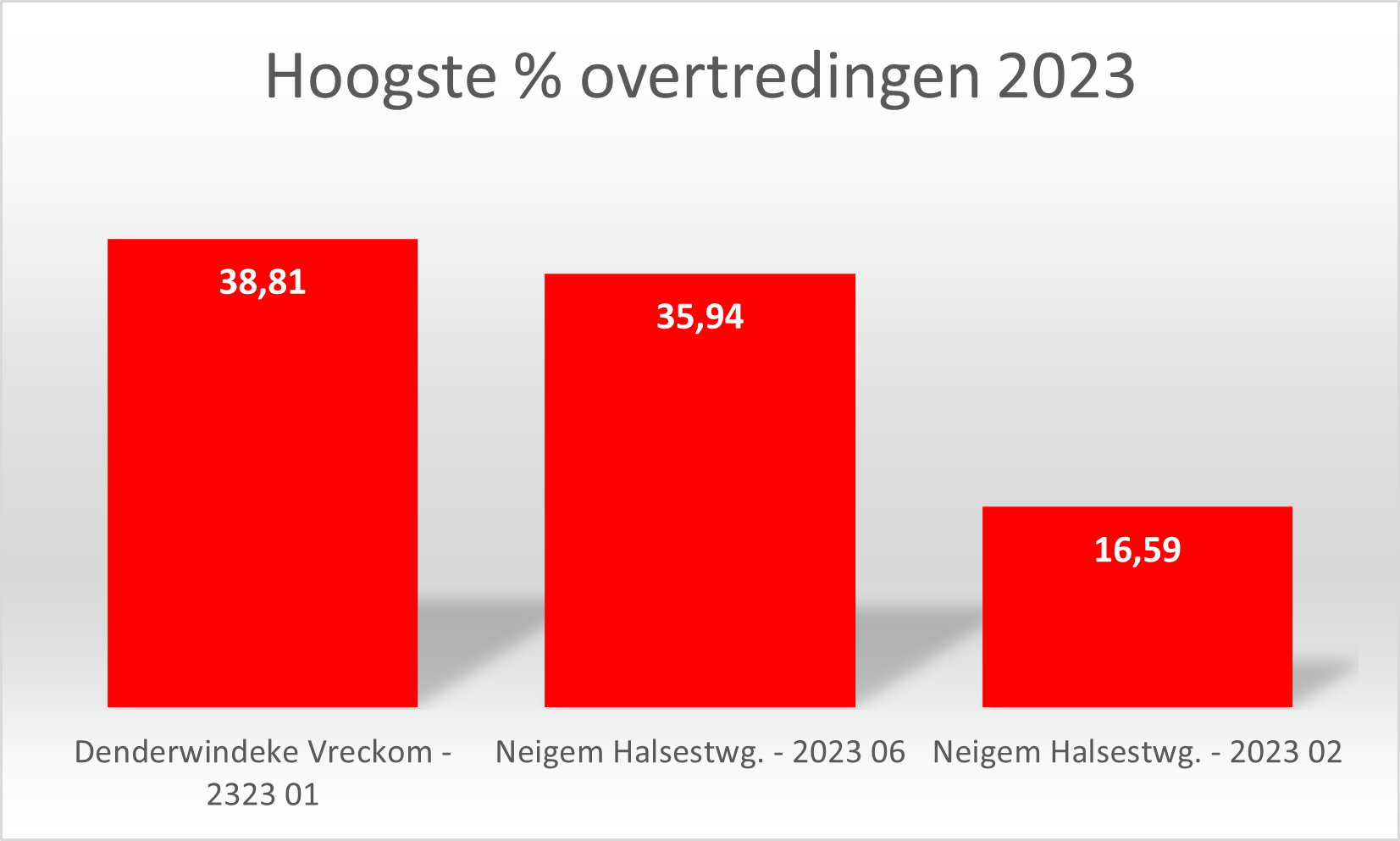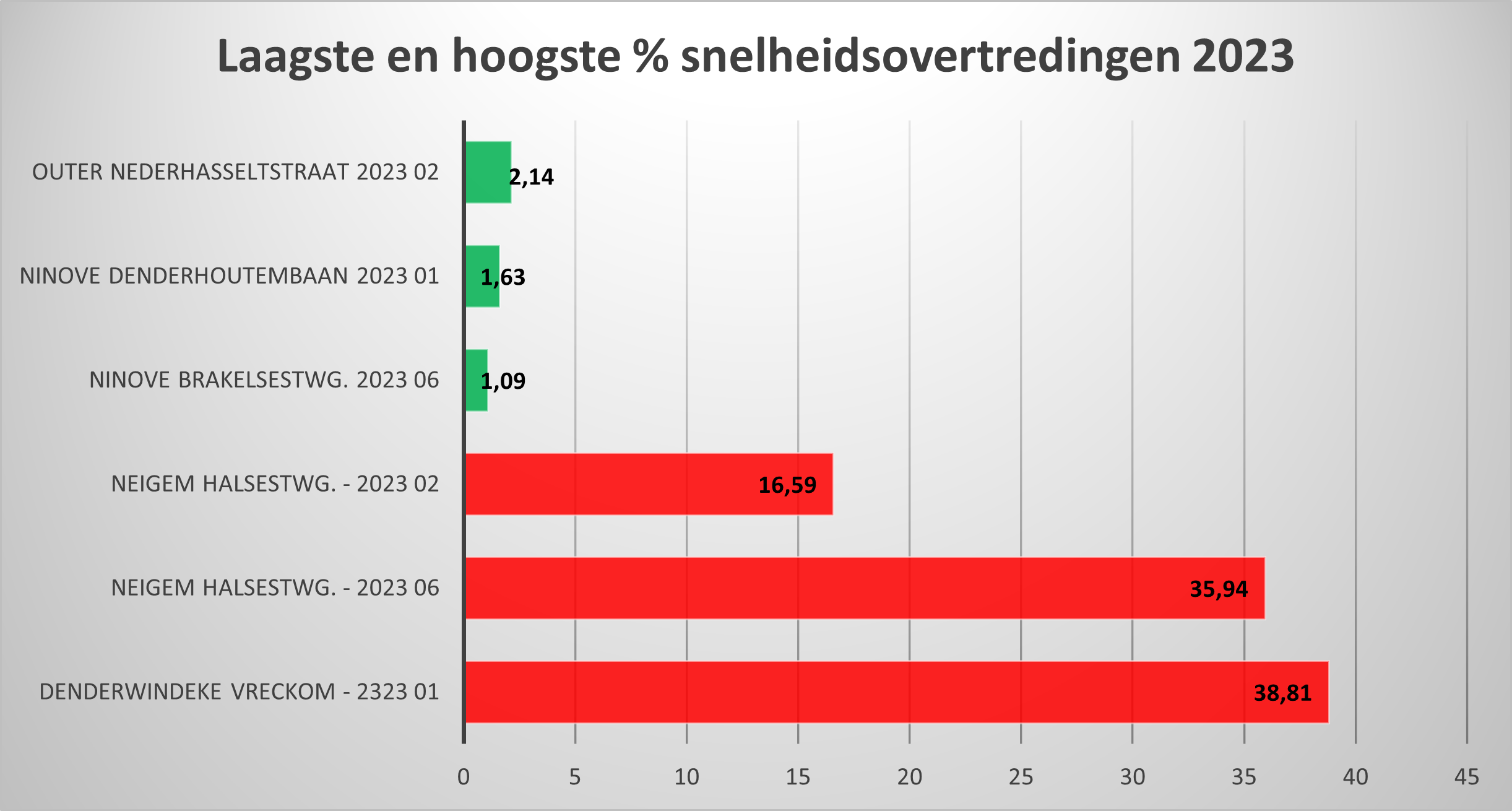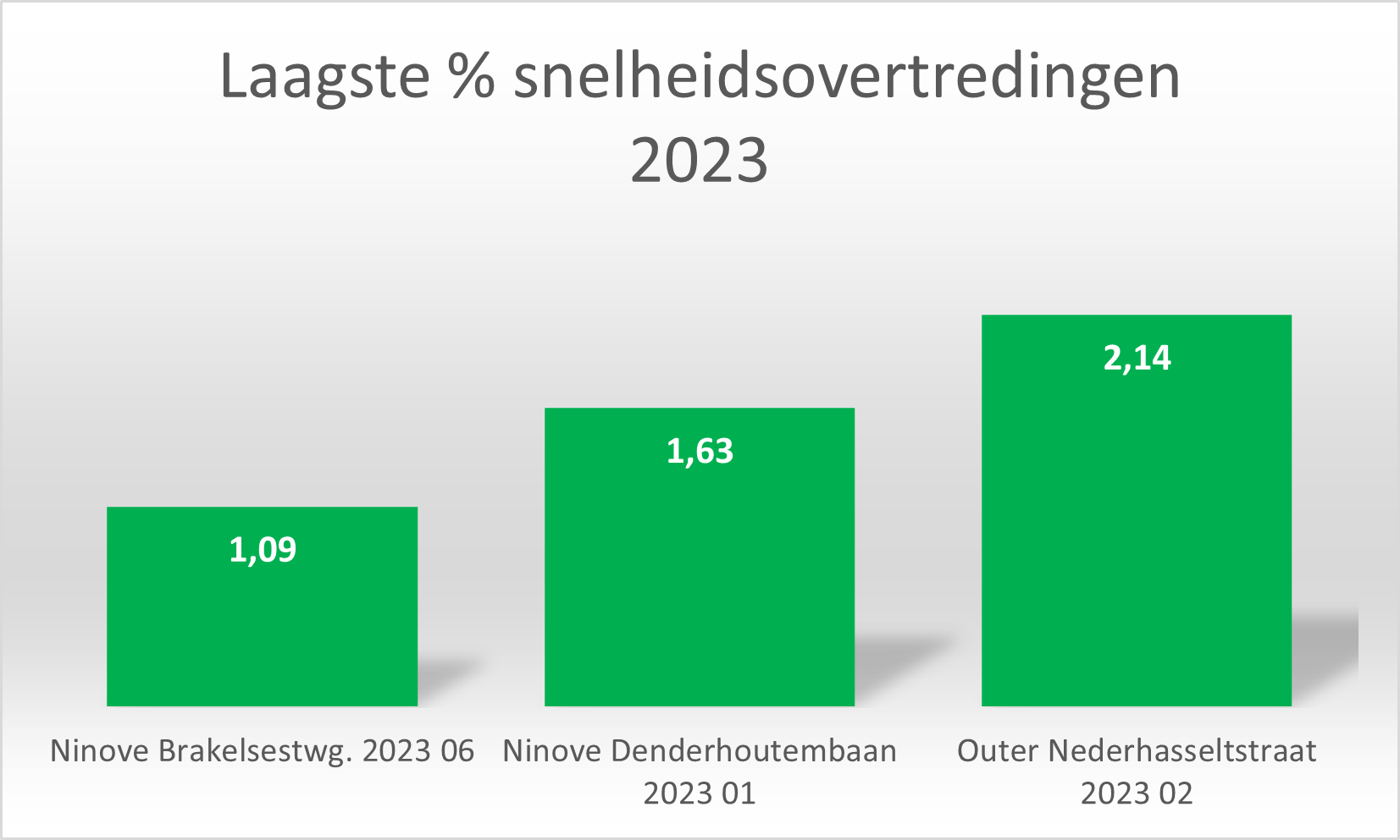 Het laagste percentage overtredingen is gemeten op de Brakelsesteenweg in Ninove ( 1,09 %); het hoogste op de Halsesteenweg in Neigem (35,94 %).
