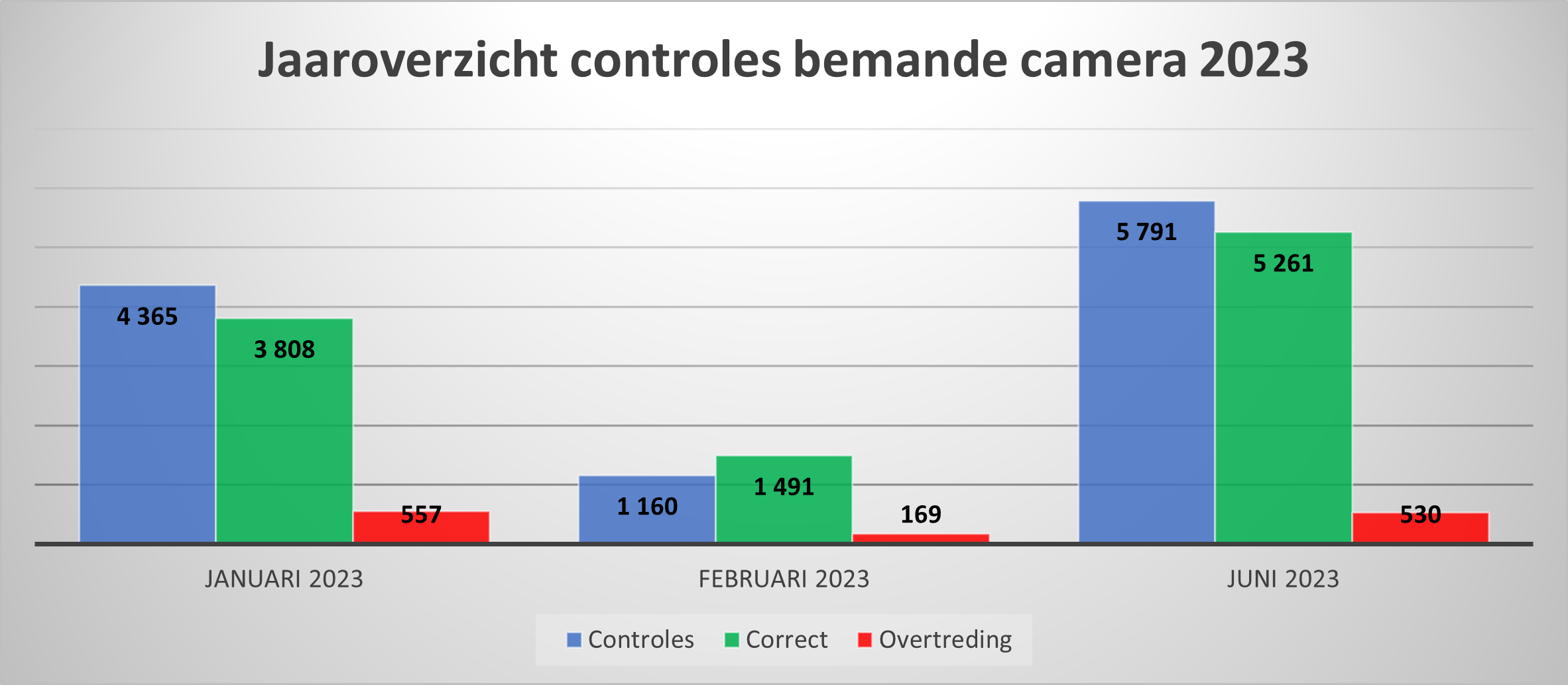 Tijdens de snelheidscontrole met bemande camera’s zijn 5.791 voertuigen gecontroleerd. Daarbij hielden 5.261 (90,85 %) chauffeurs hielden zich aan de maximale snelheid; 530 (9,15 %) reden te snel.