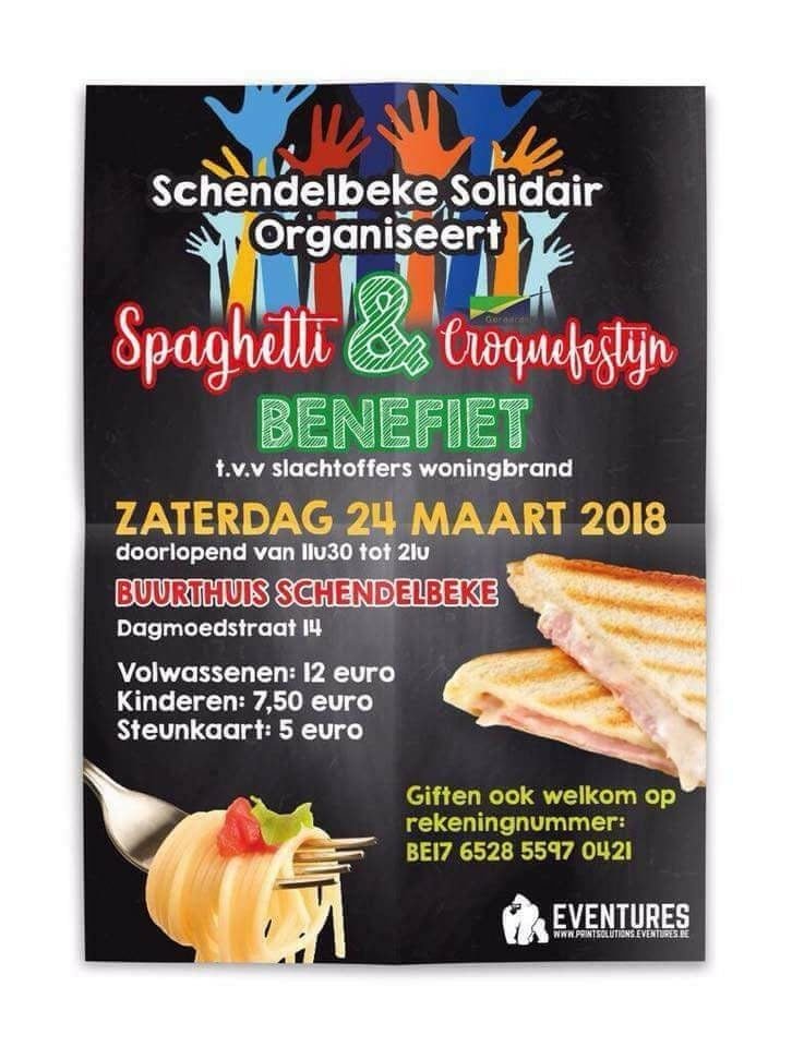 Het spaghetti & croquefestijn gaat door op 24 maart van 11u30 tot 21u in het buurthuis van Schendelbeke, Dagmoedstraat 14.
