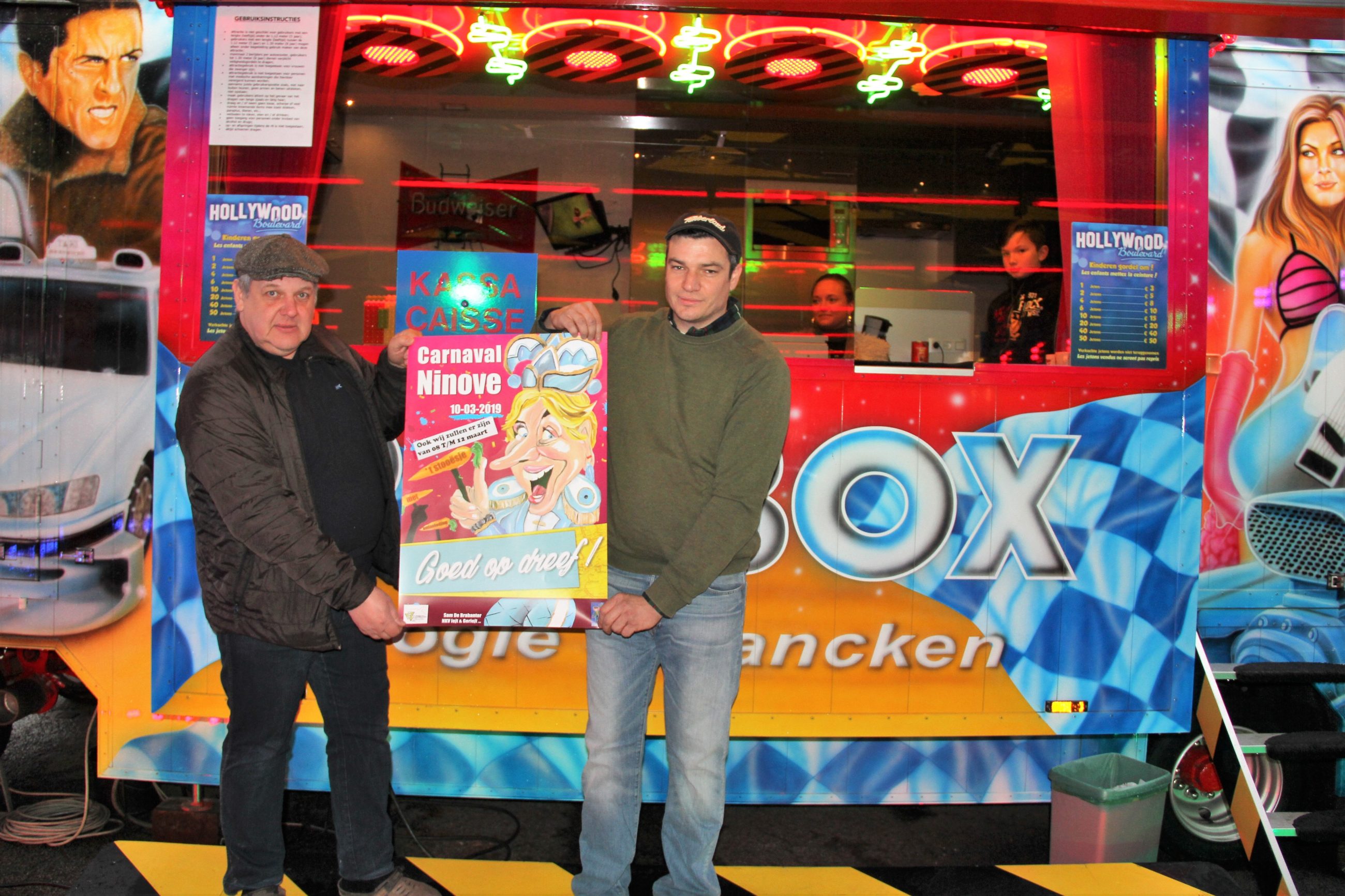 Sven van de autoscooter en Henri van de visspelen Flipper kijken al uit naar de fijne sfeer, die er in Ninove altijd is tijdens de foren en kermissen. Ze gingen dan ook graag op de foto met de carnavalsaffiche.