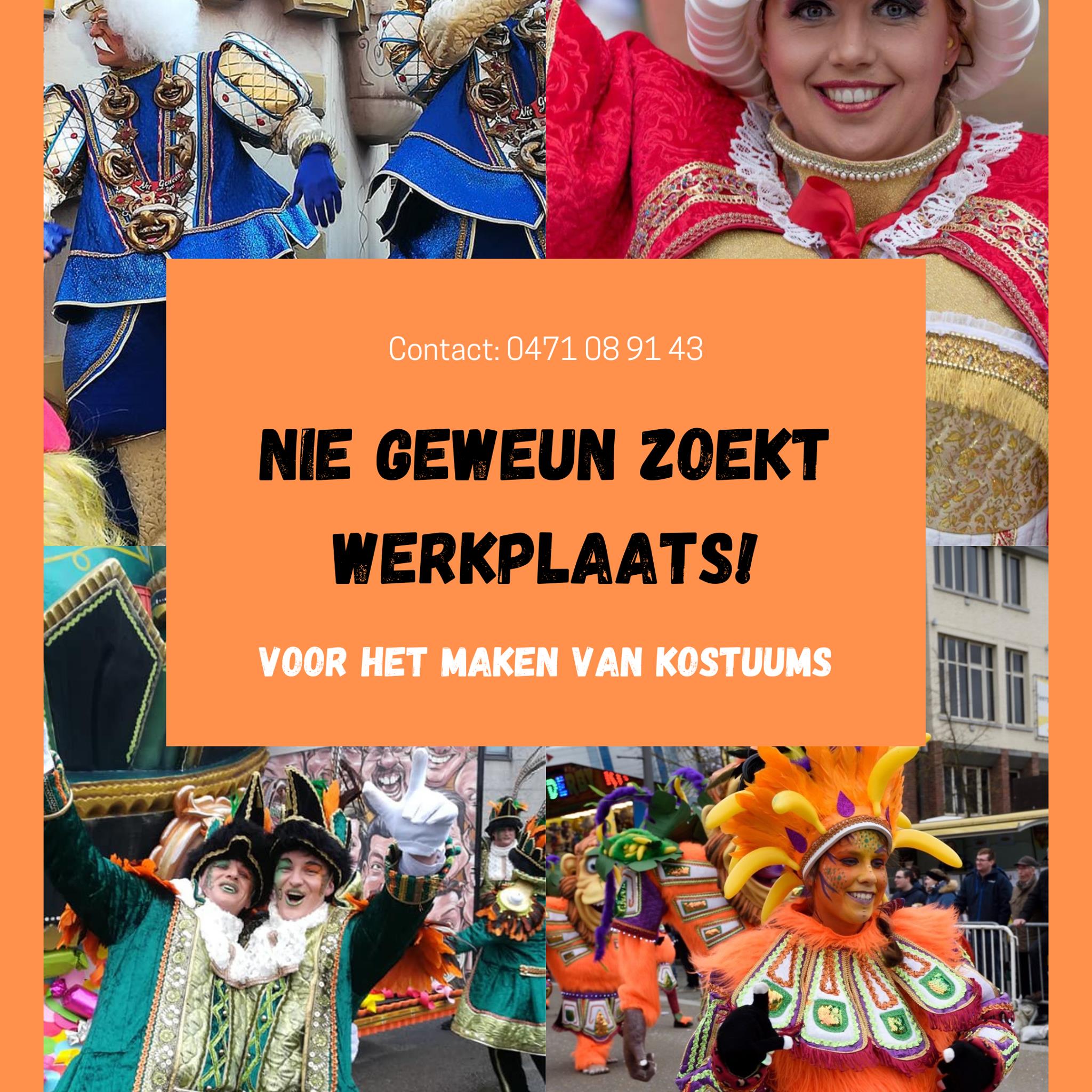 “De ‘vrauven’ van Nie Geweun zijn een plezante bende, die elk jaar zwoegt en zweet om op tijd de kostuums af te krijgen. Het zou dus zonde zijn mochten onze kostuums niet meer te zien zijn in de carnavalsstoet. Wij zijn op zoek naar een nieuwe werkplaats.”