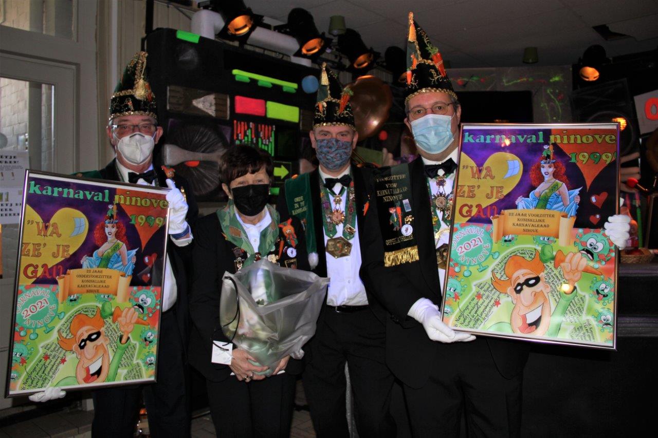 De voorzitster van de Raadsdames Lydia de Spiegeleer en ceremoniemeester Giovanni Neckebroeck overhandigden hen in naam van de Koninklijke Karnavalraad Ninove een geschenk en een aandenken. Cadeaus, die ze zichtbaar verrast aanvaardden.