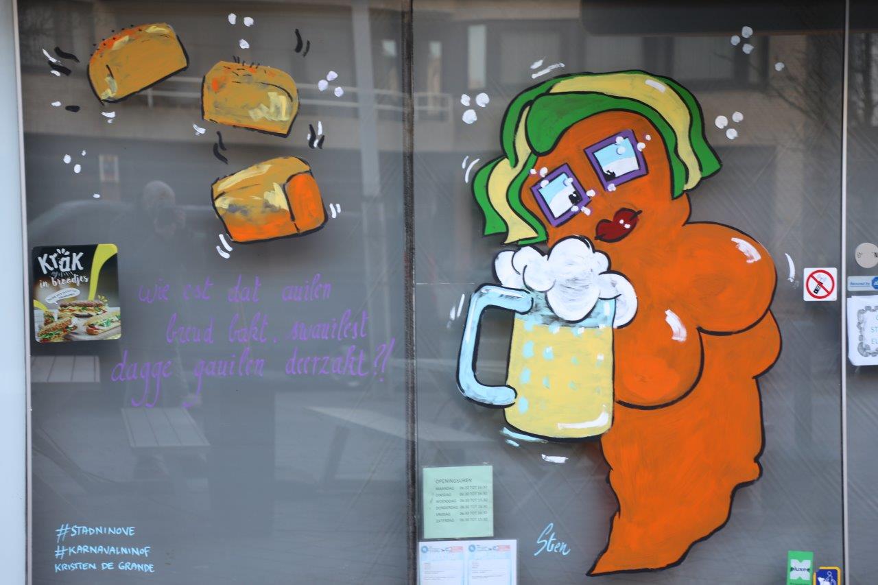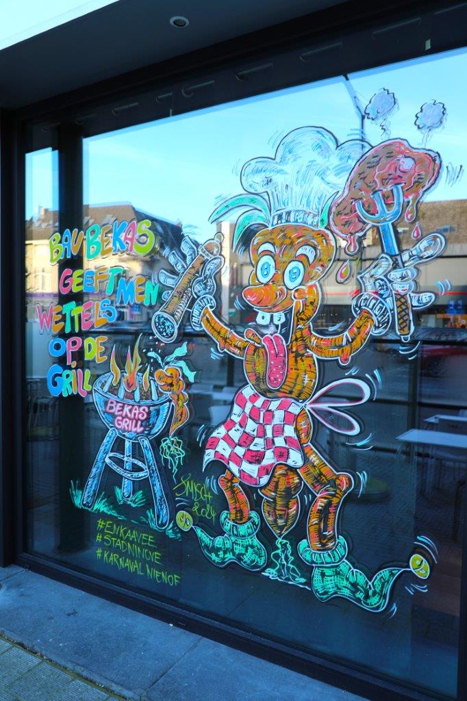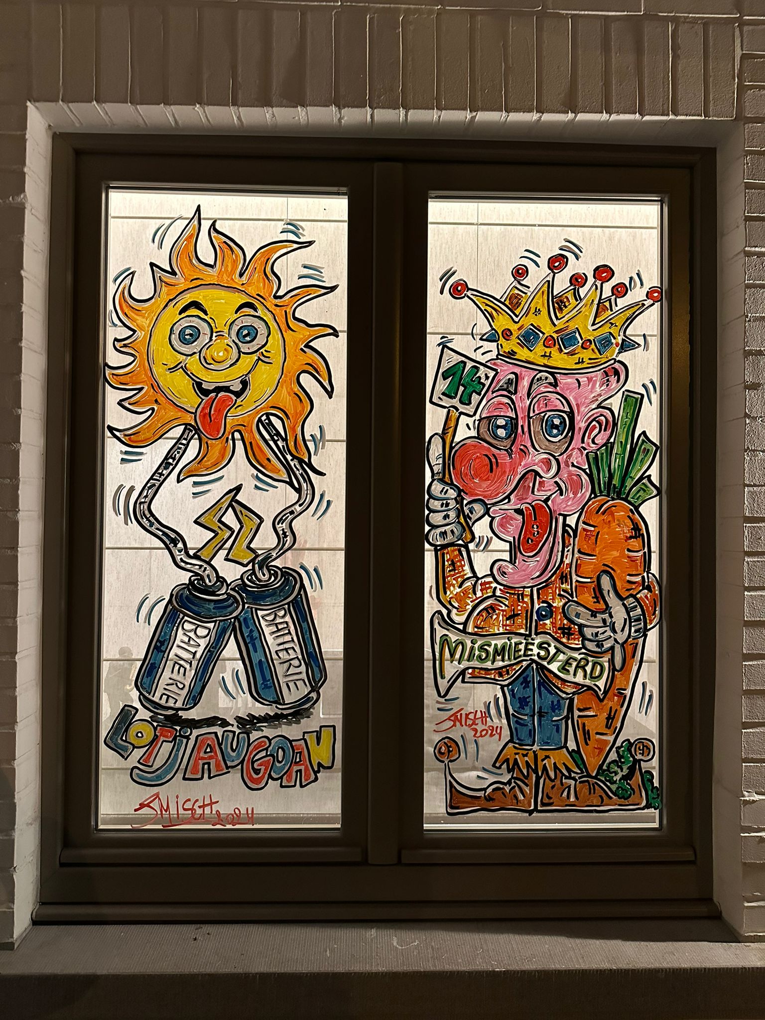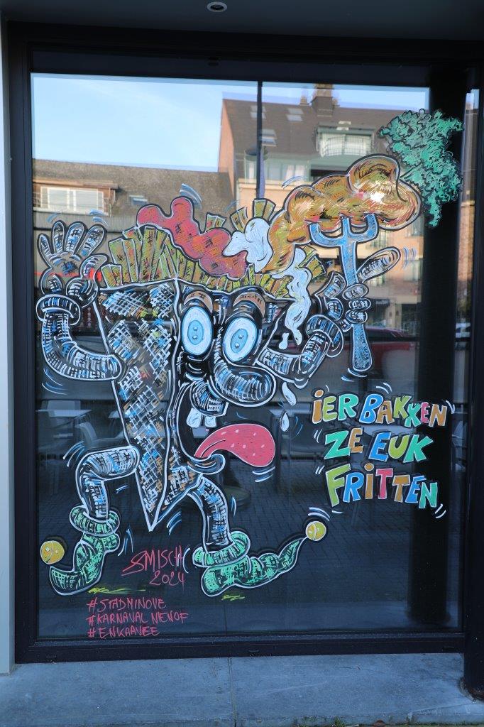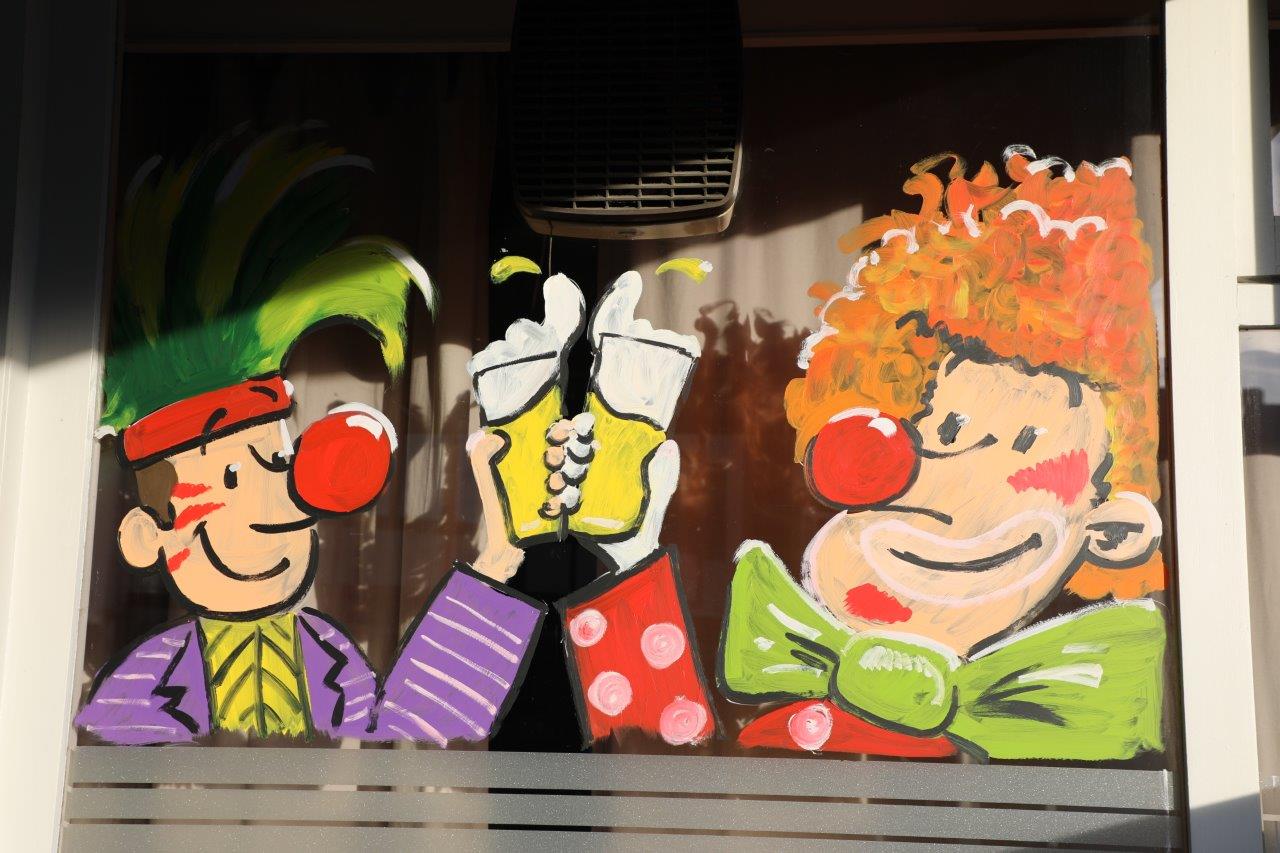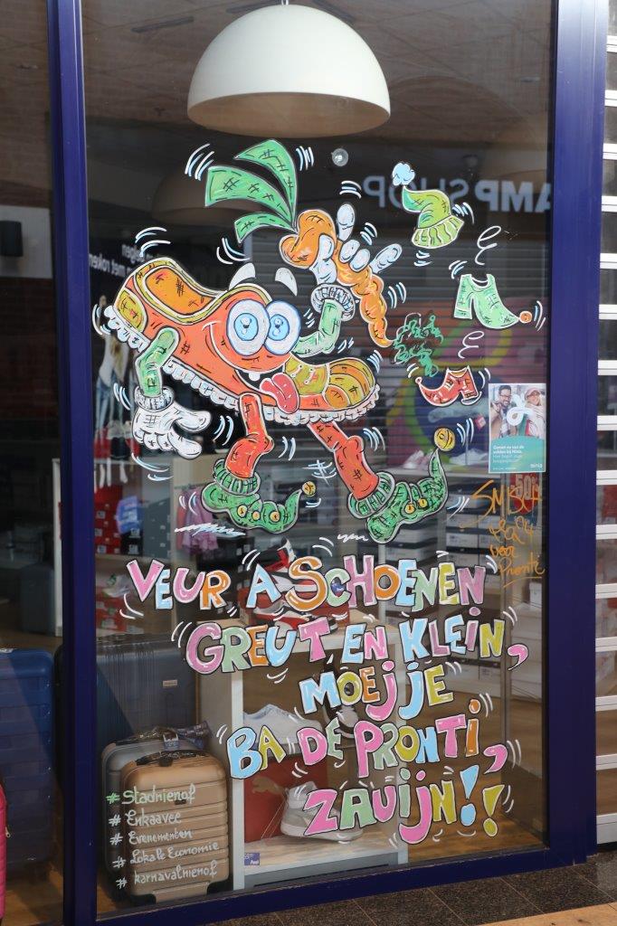 Onder begeleiding van ervaren roeëtjeklasjers kregen de ruiten een ludieke tekening, waardoor ook daar de volgende weken de carnavalssfeer volop aanwezig is.