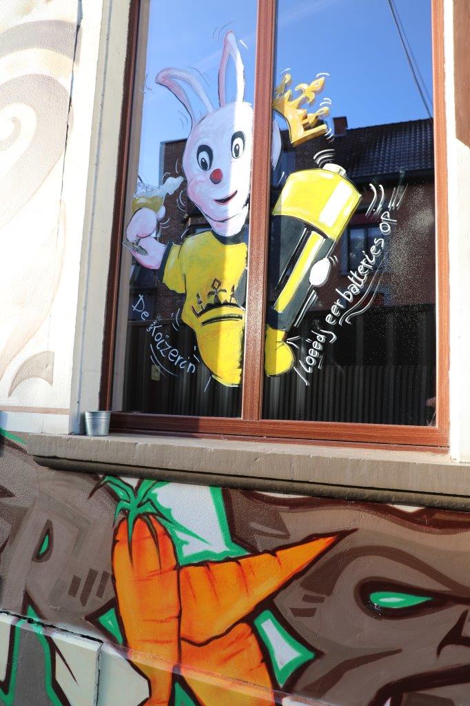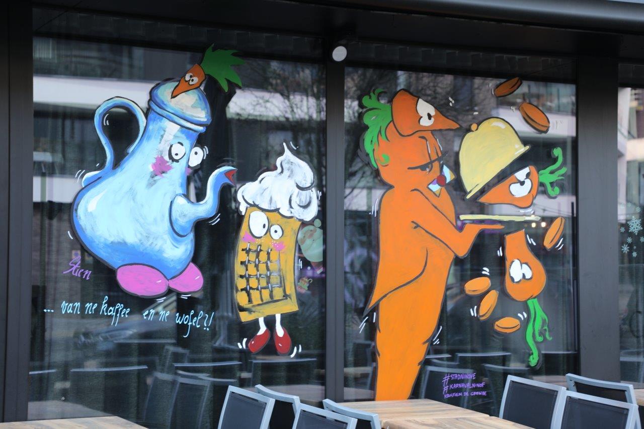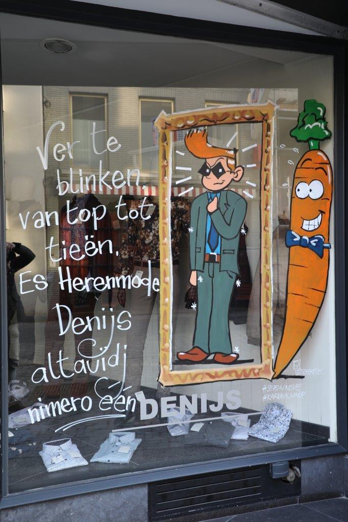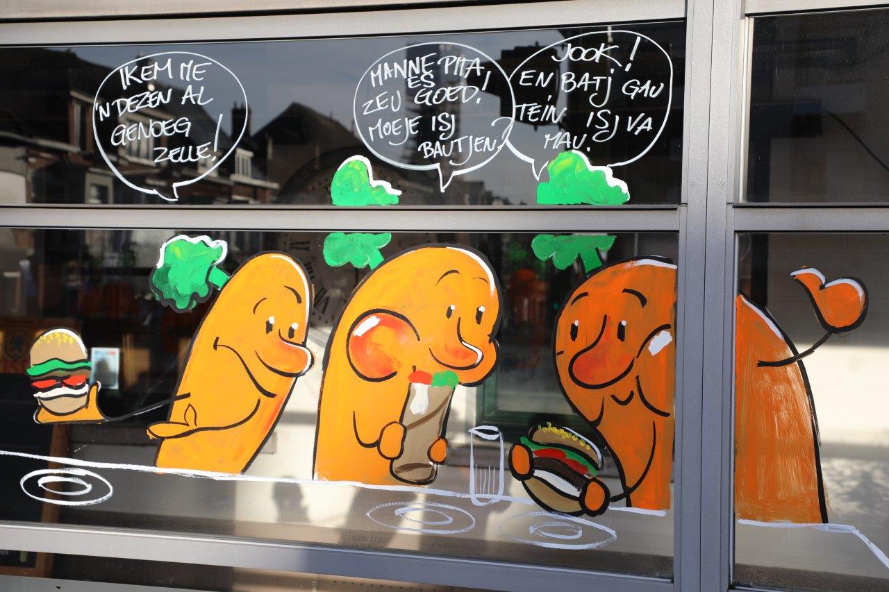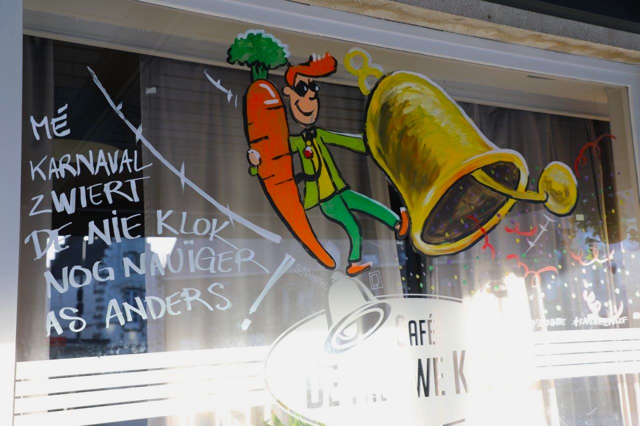 Onder begeleiding van ervaren roeëtjeklasjers kregen de ruiten een ludieke tekening, waardoor ook daar de volgende weken de carnavalssfeer volop aanwezig is.