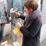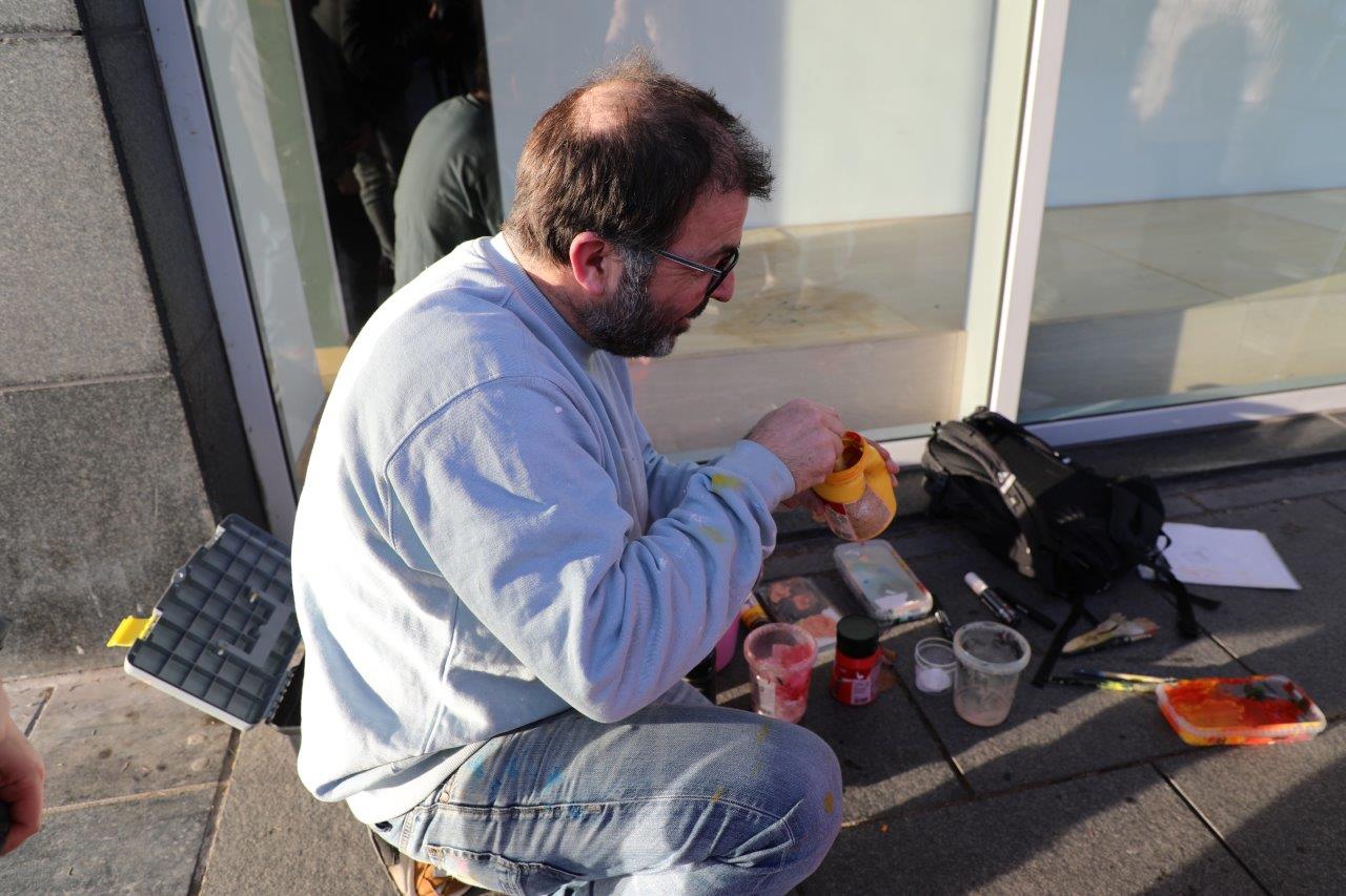 Er zijn zes kunstenaars op pad: Roderik, Luk, Smisj, Stien, Liesbeth en Kristien. De ene werkt met verf, een andere met stiften.