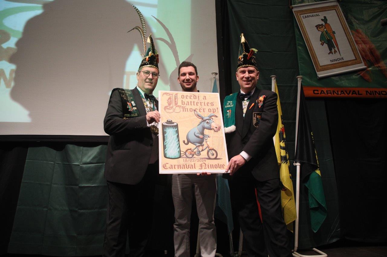 Pascal Carael en Giovanni Neckebroeck van de Koninklijke Karnavalraad mochten tot slot de winnaars bekendmaken van de affiche voor carnaval 2024. Hiervoor waren maar liefst 13 ontwerpen van 14 carnavalisten ingediend.