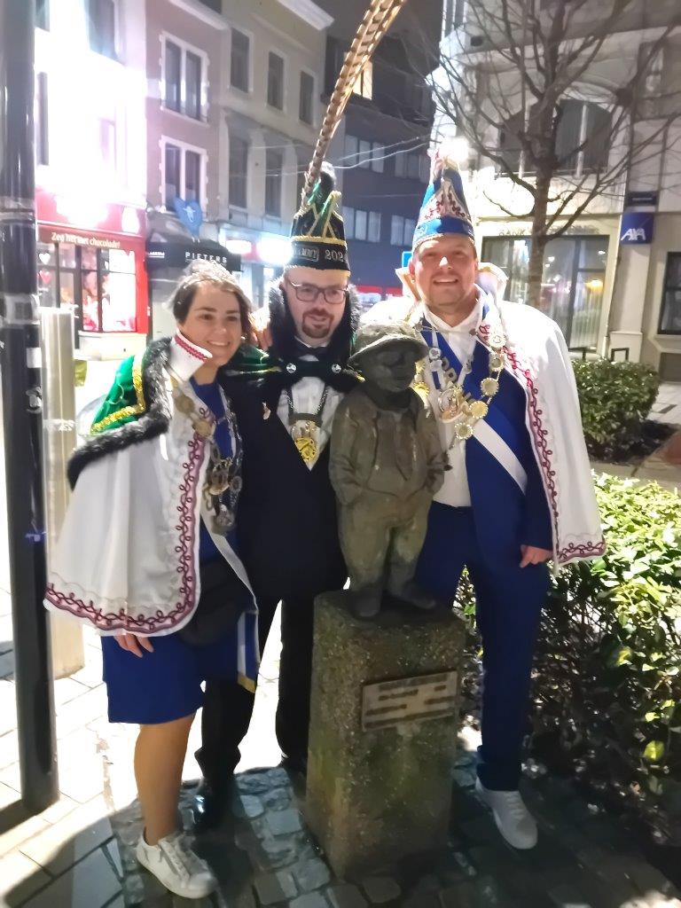 Bij zijn aankomst bracht prins Sammy samen met het Halse prinsenpaar een bezoek aan het carnavalsmonument van de Vaantjesboer.