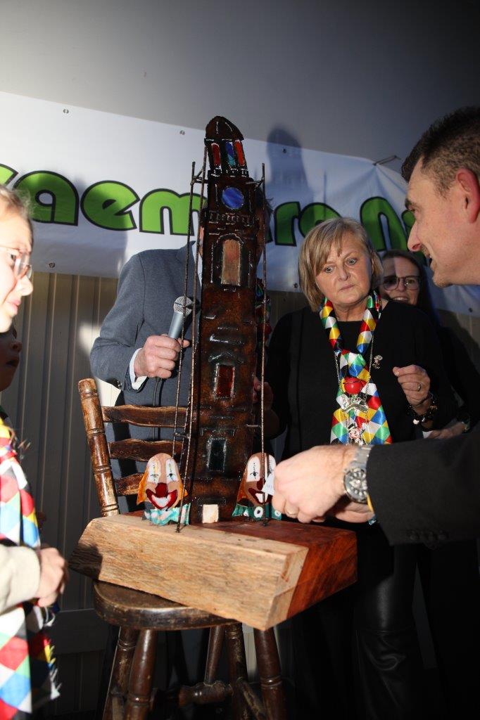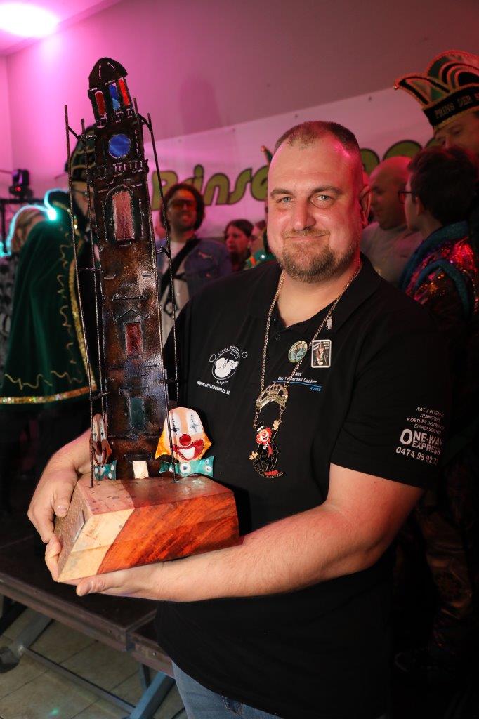 Het torenkunstwerk ging naar de winnaar van de grote Don Augustprijs, NKV Van ‘t Alverdrau Donker. Ze wonnen afgetekend met hun uitbeelding van ‘De poëters op tournee’. De hele stoet lang zongen en swingden de leden heerlijk op hun drie praalwagens, waarbij ze het beste van zichzelf gaven en het publiek entertainden, helemaal in de lijn van waar de Don Augustprijs voor staat.