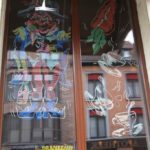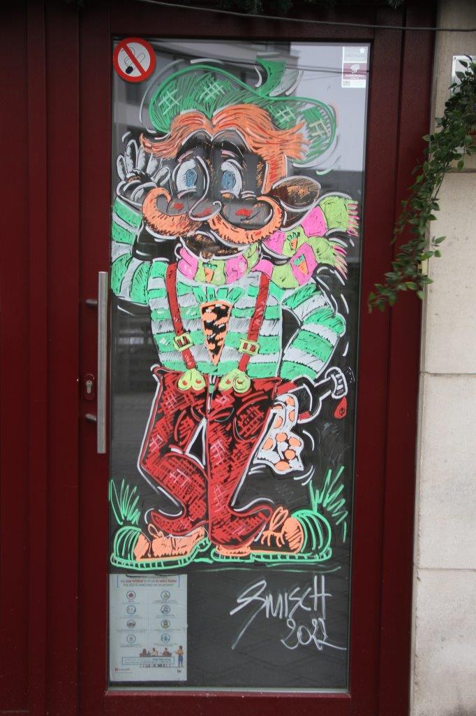 Op elke ruit of etalage van een café of handelszaak komt een gepersonaliseerde tekening. Deze verwijst naar de activiteit, die daar plaatsvindt.