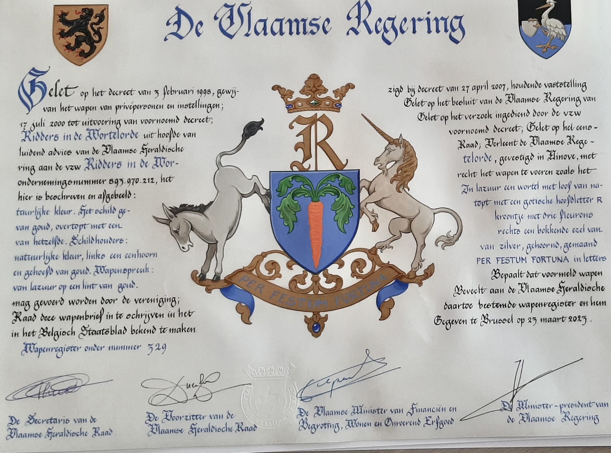Maar niet getreurd: 61 jaar na hun stichting in maart 1962 hebben de Ridders in de Wortelorde hun officiële erkenning. Zij ontvingen op 30 juni uit handen van minister Matthias Diependaele hun wapenbrief. Daardoor treden zij toe tot de Vlaamse heraldiek.