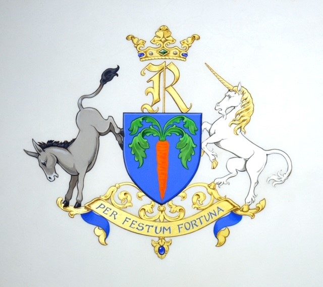 Voor de spreuk stoften de Ridders hun Latijnse kennis af: ‘per festum fortuna’, geluk door feest. Mensen worden doorgaans gelukkig als ze kunnen feesten.