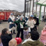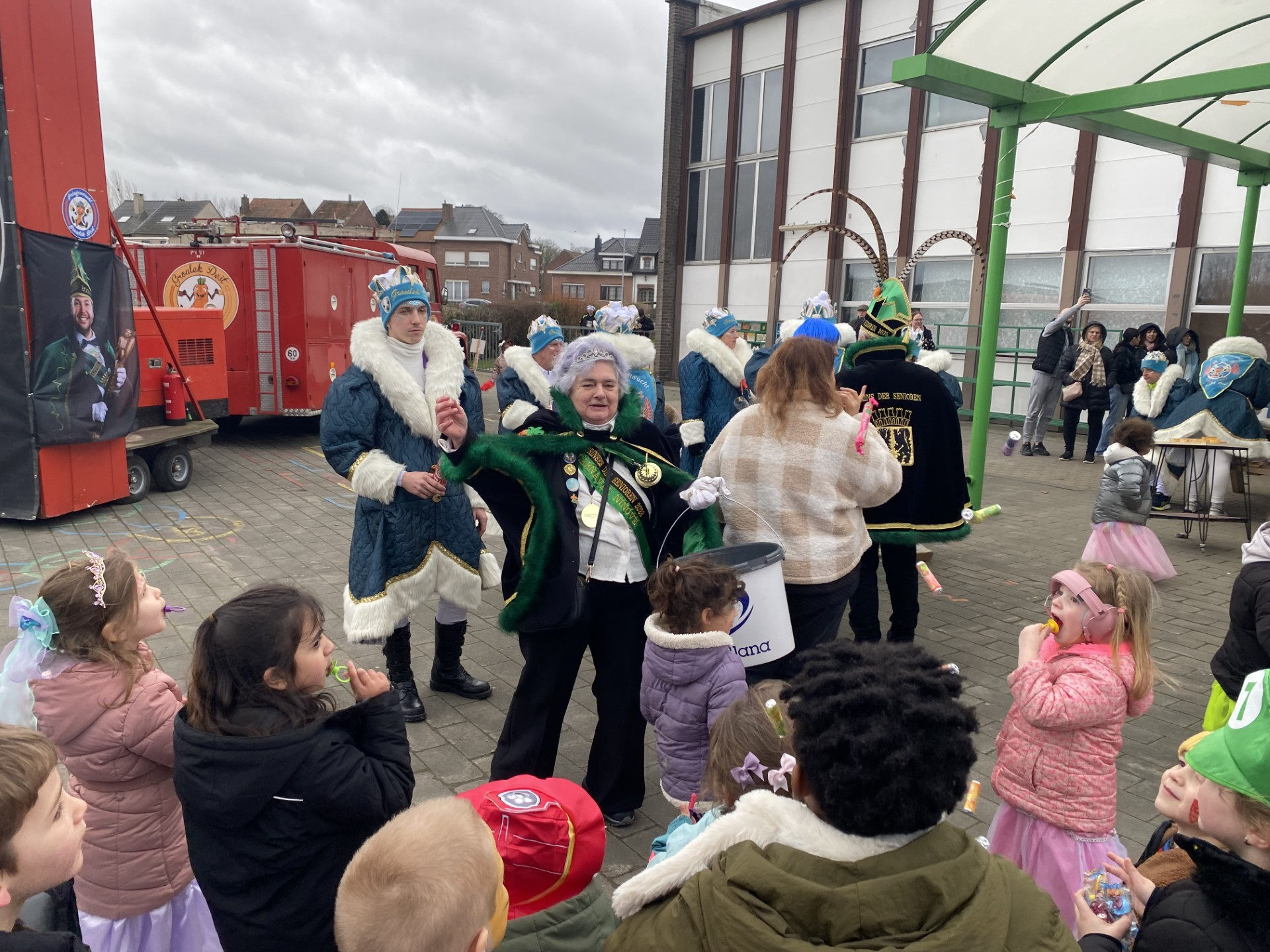 De sfeer bereikte een hoogtepunt toen De Meerbeekse carnavalsgroep Graulek Dest onder luide muziek met hun indrukwekkende wagen de speelplaats aan de Kapellestraat opreed. Ze kregen hierbij alle voetjes, van de kleinste kleuter tot de directie, moeiteloos aan het dansen.
