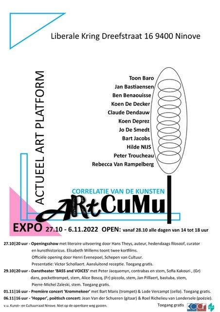 Al deze facetten komen nu voor een eerste maal samen in de tentoonstelling ‘ARTCuMuL’, waar het brandpunt ligt op de verbinding van alle voornoemde kunstvormen. De kunstenaarskern, die deelneemt aan ‘ARTCuMuL’ woont, werkt of heeft banden in en met Ninove.