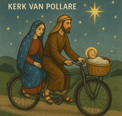 Volgens het kerstverhaal waren Maria en Jozef na Jezus’ geboorte zelf vluchtelingen. Op de affiche zie je het meteen: Maria en Jozef op een tandem, met Jezus in het mandje. Een speels maar betekenisvol beeld, dat verwijst naar het verhaal van het jonge gezin uit Bethlehem, op de vlucht, zoekend naar veiligheid en een toekomst in Egypte.