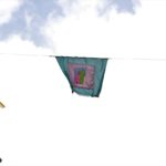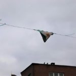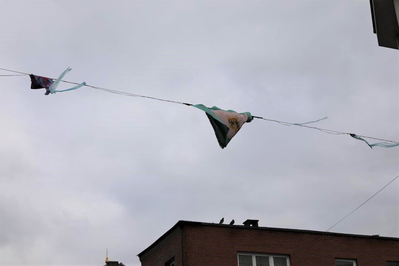 Maar al na enkele dagen heeft de wind voor schade gezorgd aan de vlaggen. Enkele zijn reeds gescheurd, andere zijn rond de draden gedraaid, waaraan ze zijn ophangen. Dat is niet echt het fraaie zicht, dat de makers voor ogen hadden.