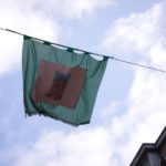 De wijze waarop ze zijn bevestigd, is duidelijk niet de geschikte manier. Om te voorkomen, dat de vlaggen zich rond de draden draaien en kapot vliegen, is een metalen kader nodig. Op die manier blijven de vlaggen strak gespannen hangen. Dat is hier niet het geval.