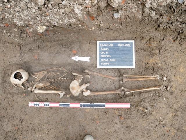 Vooraan het perceel kwam tijdens het onderzoek ook een menselijke begraving aan het licht, die dateert uit de late middeleeuwen. De oriëntatie van het skelet, dat bovendien op de buik lag, roept bij de archeologen veel vragen op. Begravingen gebeurden normaal gezien met het hoofd naar het westen, terwijl hier het hoofd naar het noorden ligt. Begravingen op de buik komen zelden voor.”