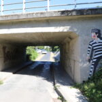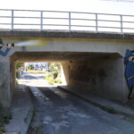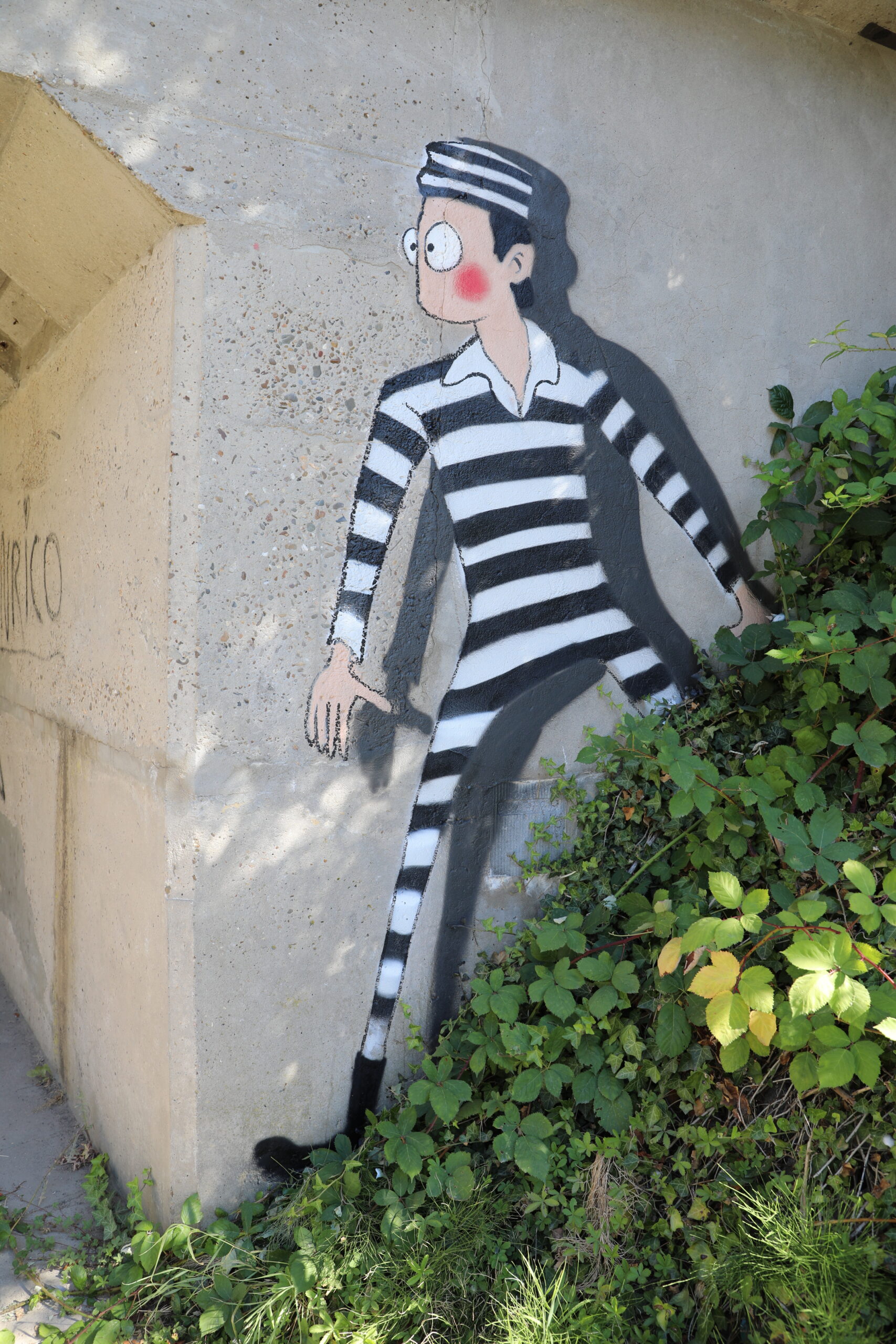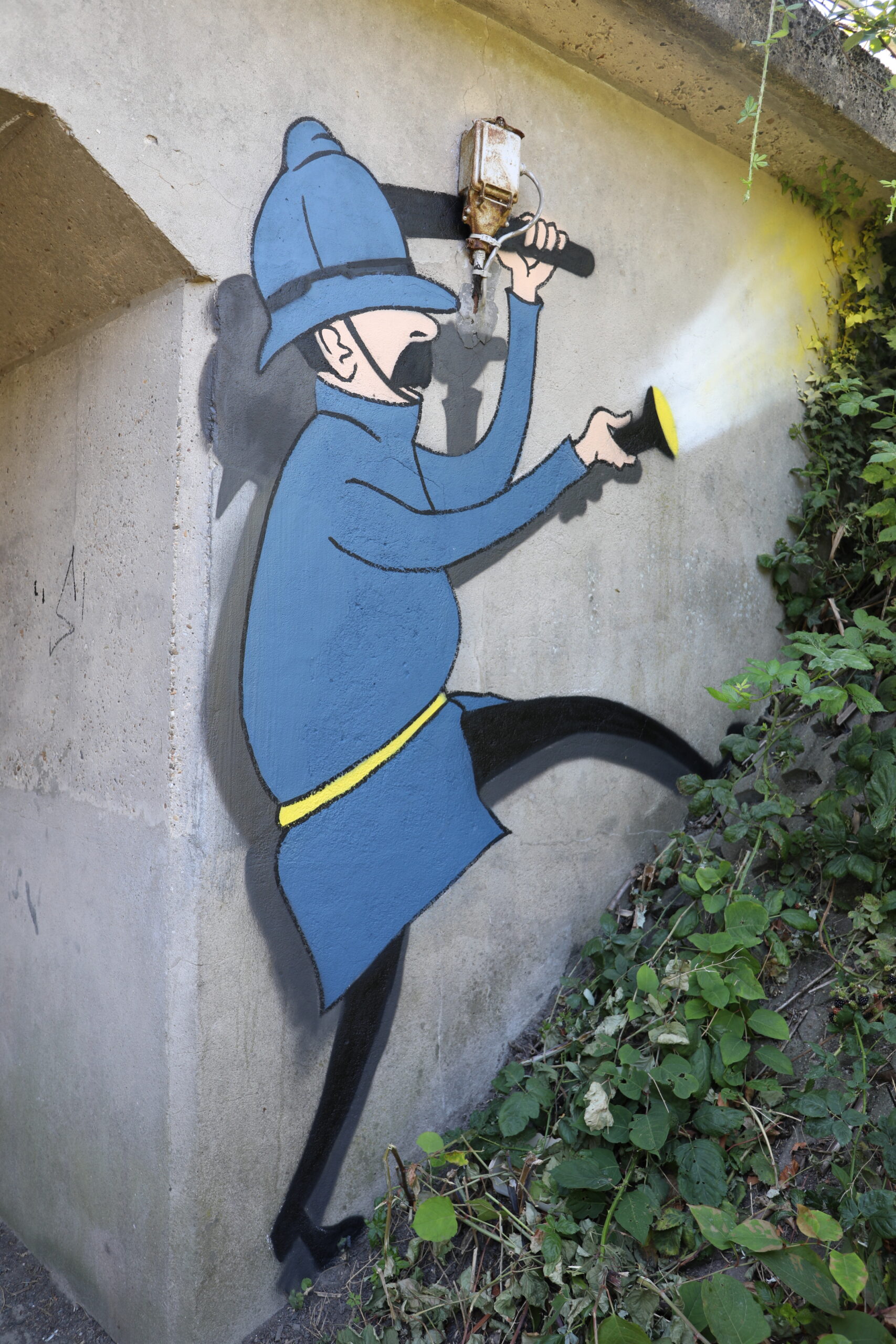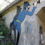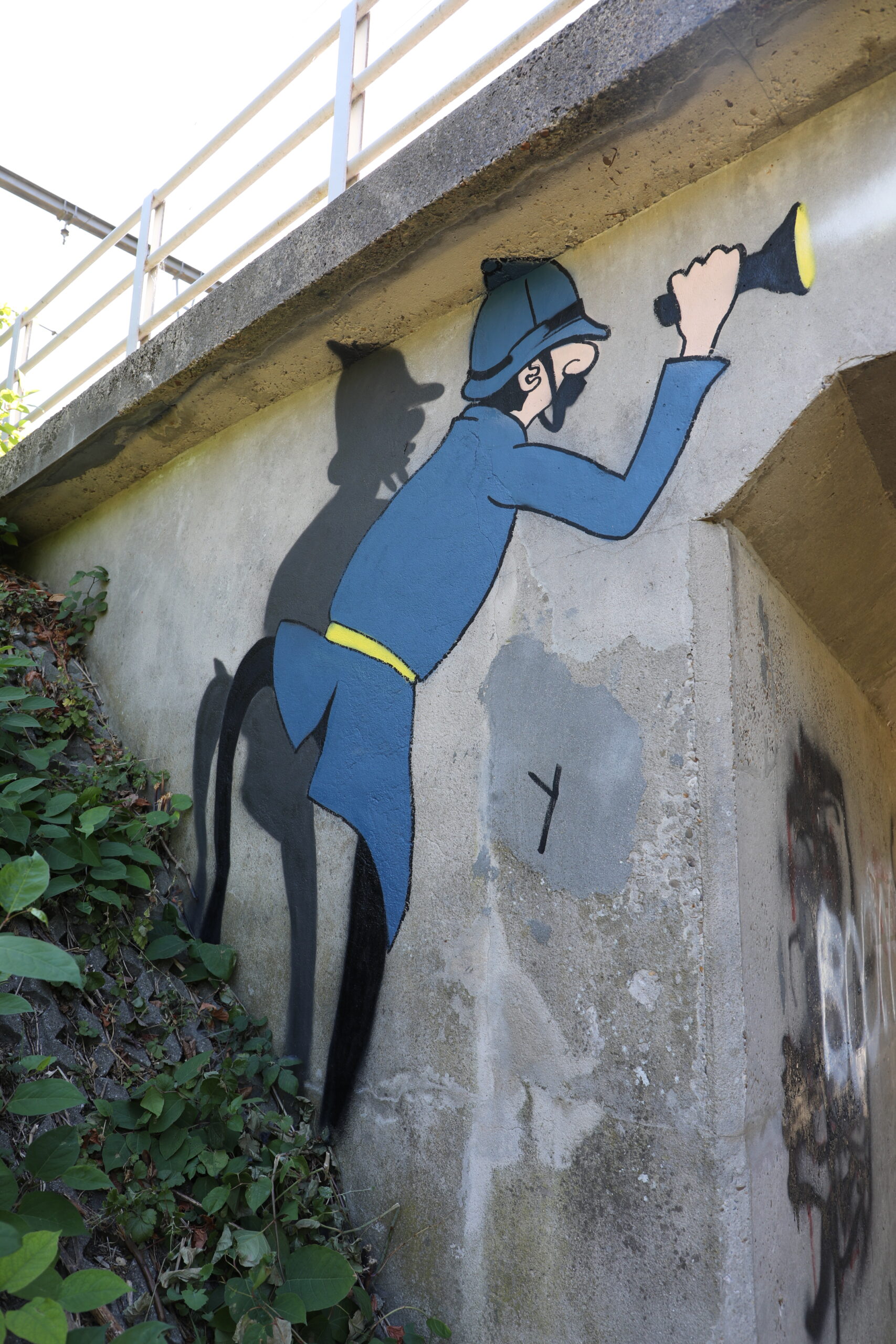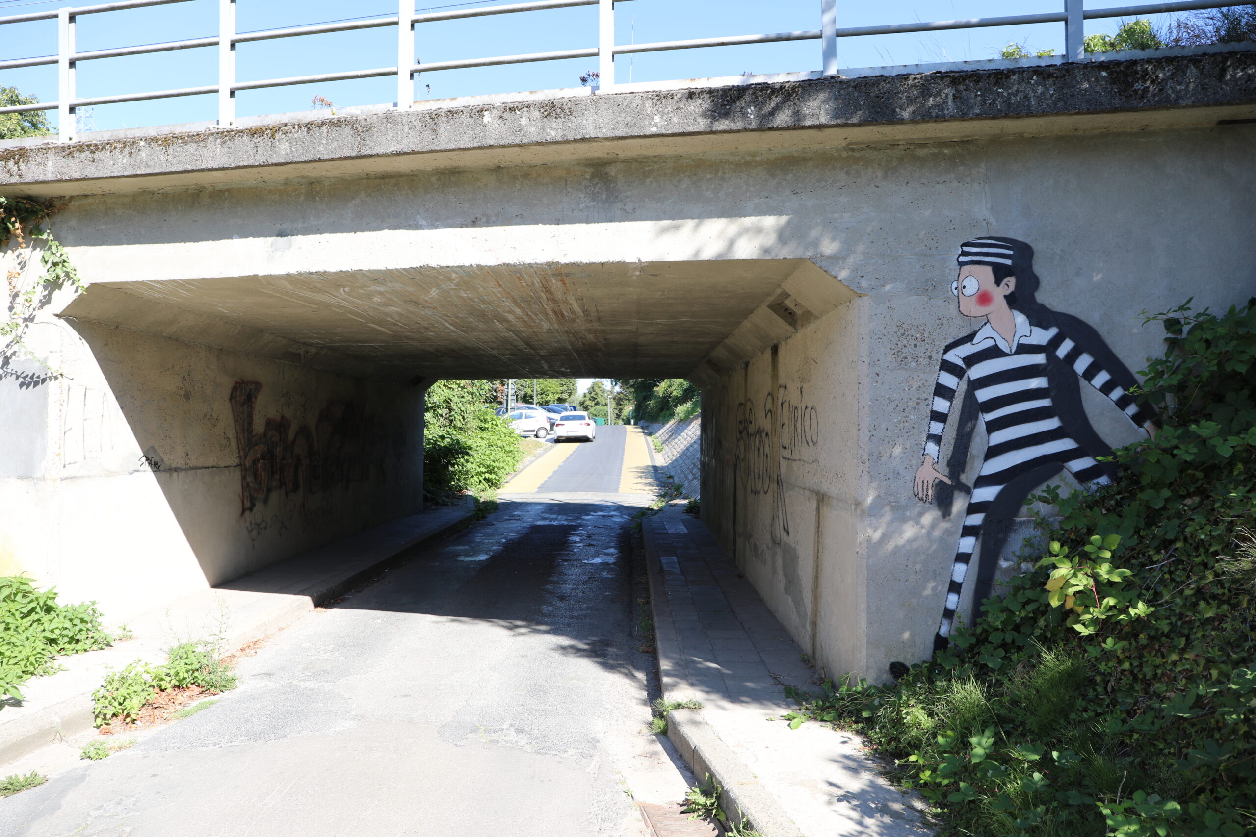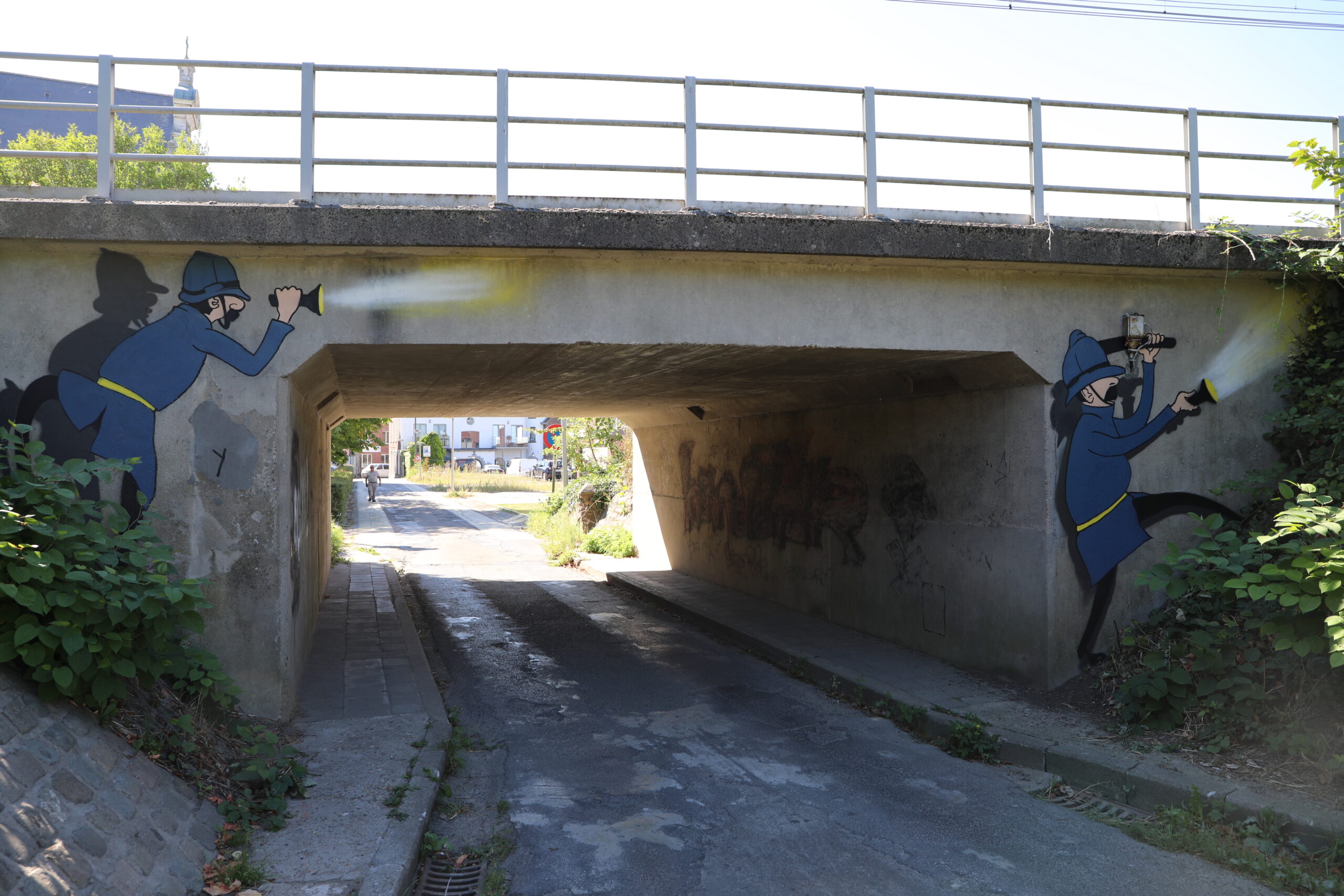 Het eerste werk dook op aan de spoorwegbrug in de Kloosterweg. Het graffitikunstwerk beeldt een opvallend tafereel uit. Maar om het volledige werk te zien moet je beide zijden van de brug bekijken.