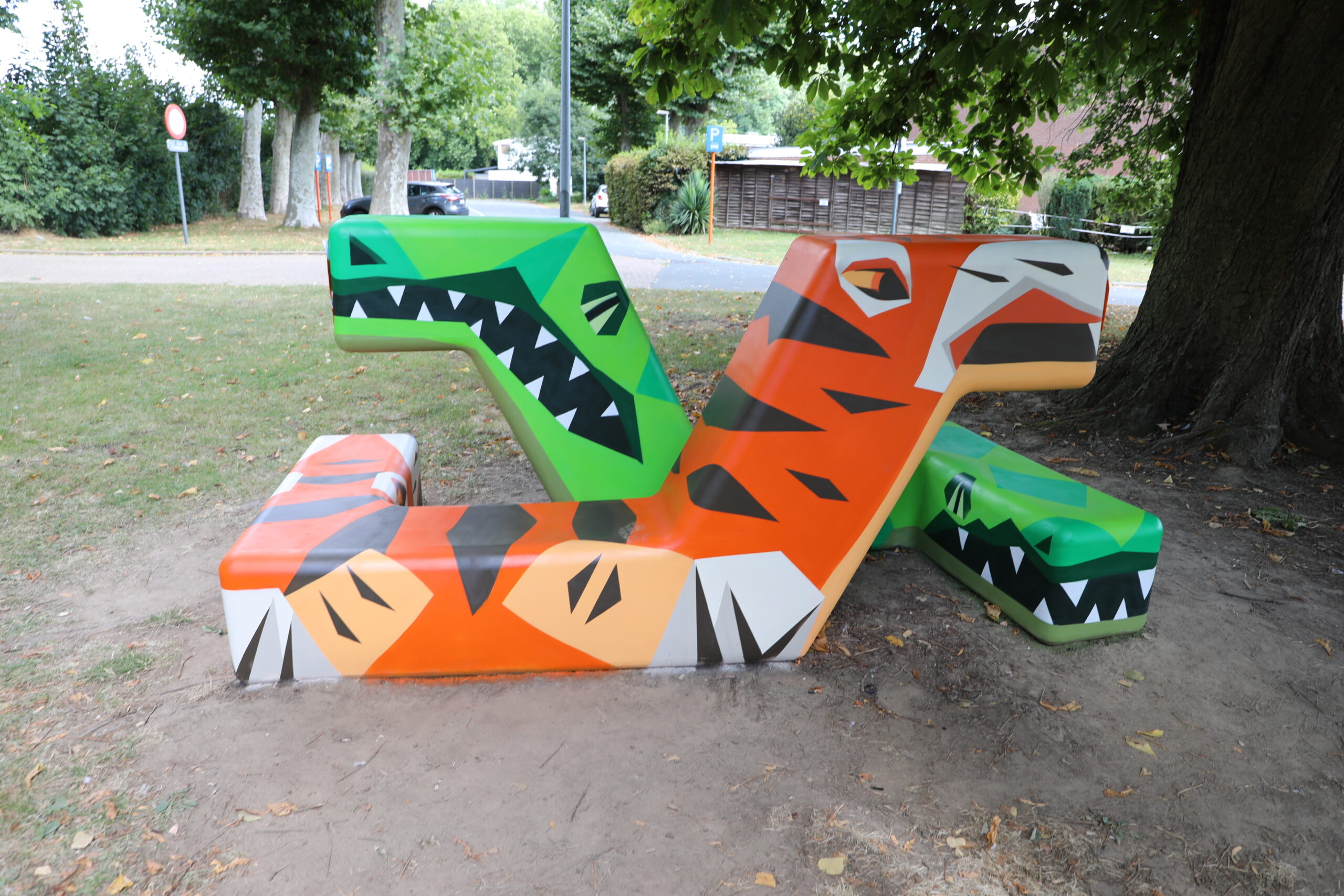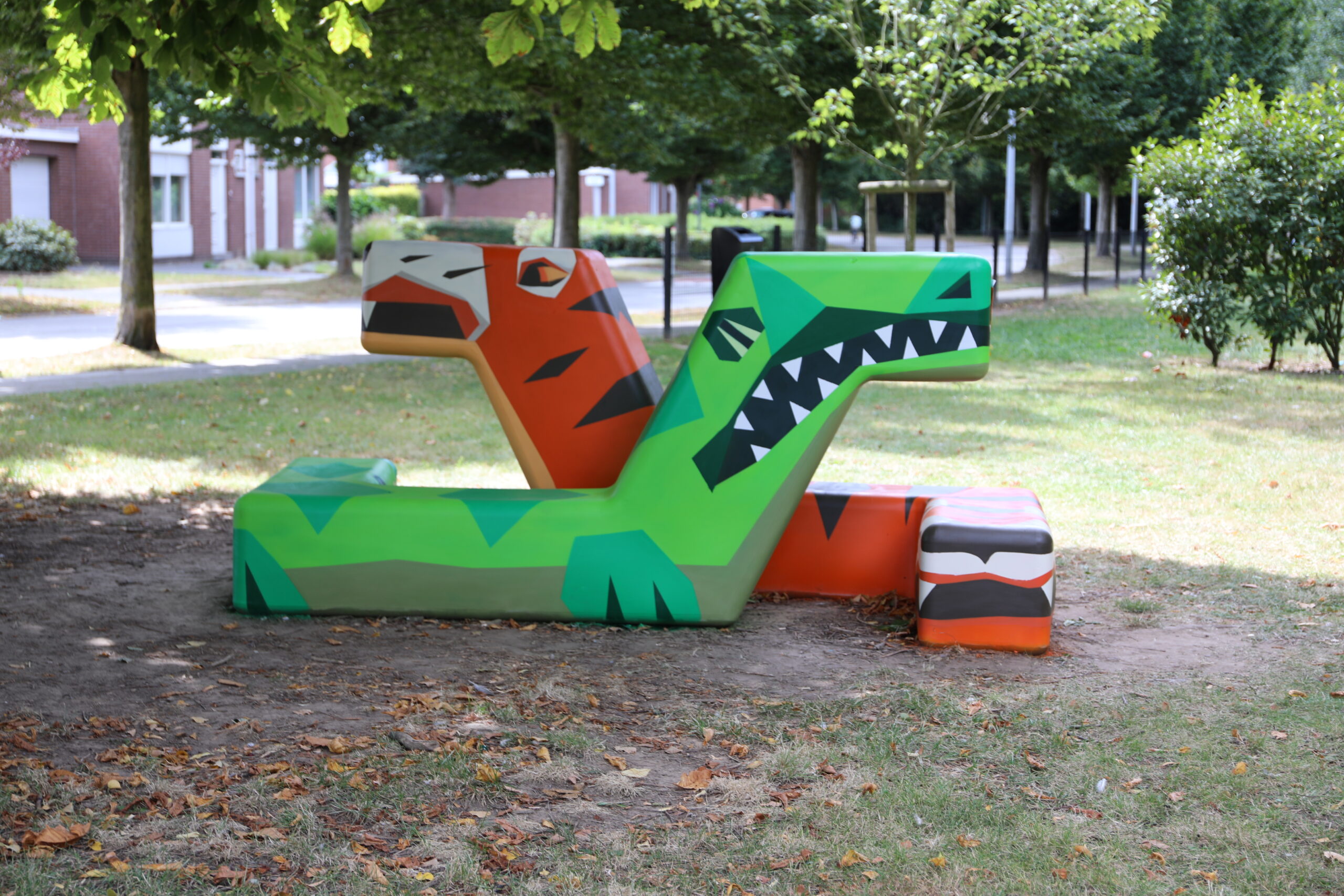 Woensdag 23 augustus dook een tweede werk op in de wijk Groeneweg. Daar is een speeltoestel voorzien van kleurrijke dierenprints: een tijger en een krokodil.
